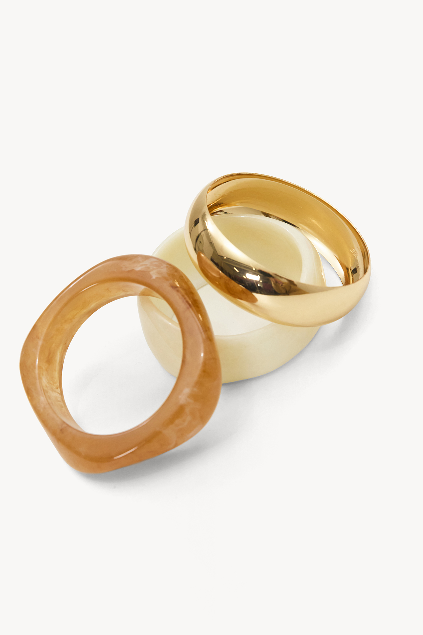 Bracelet set 3-pack EUR 19.99This statement bracelet set combines three different textures in warm nude and gold tones. The set includes a shiny gold-colored bracelet, a matte beige variant, and a transparent nude bracelet for a varied look. The high-quality stainless steel gold-plated finish ensures durability and a luxurious appearance. Style these bracelets together for a stacked effect or wear them individually for a subtle accent.