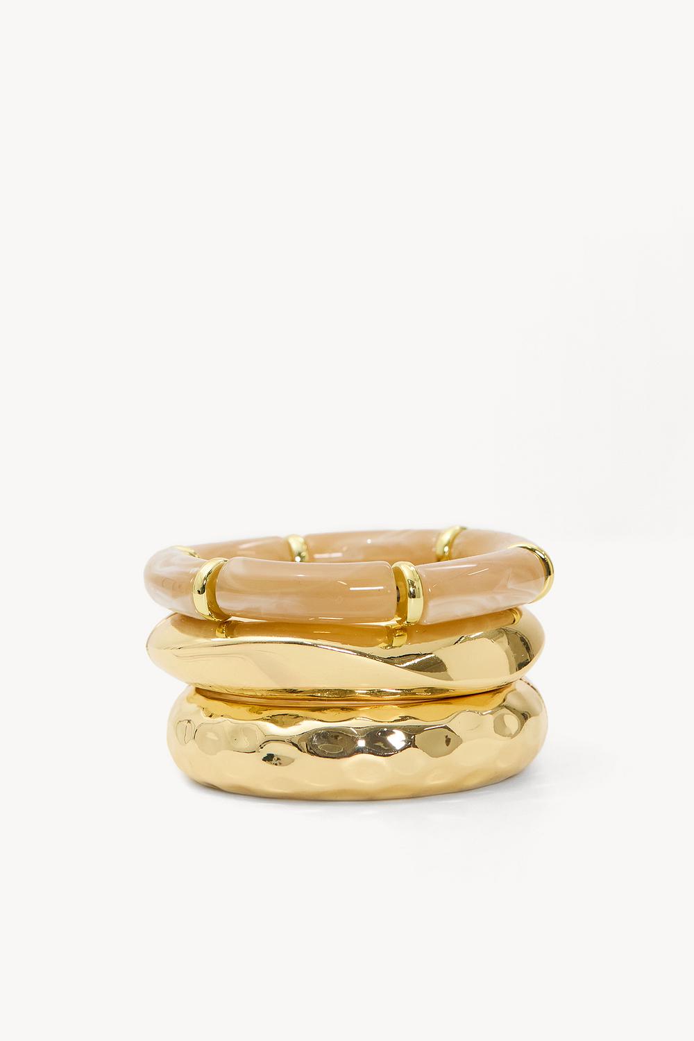 Gold bracelets 3-pack EUR 19.99This gold bracelet set consists of three different statement bracelets for a luxurious layered look. The mix of chunky chain links and smooth bangle designs creates a modern twist on classic gold jewelry. The high-quality stainless steel with gold plating ensures durability and a premium appearance. Style this set together for maximum impact or wear them separately for a more subtle touch.