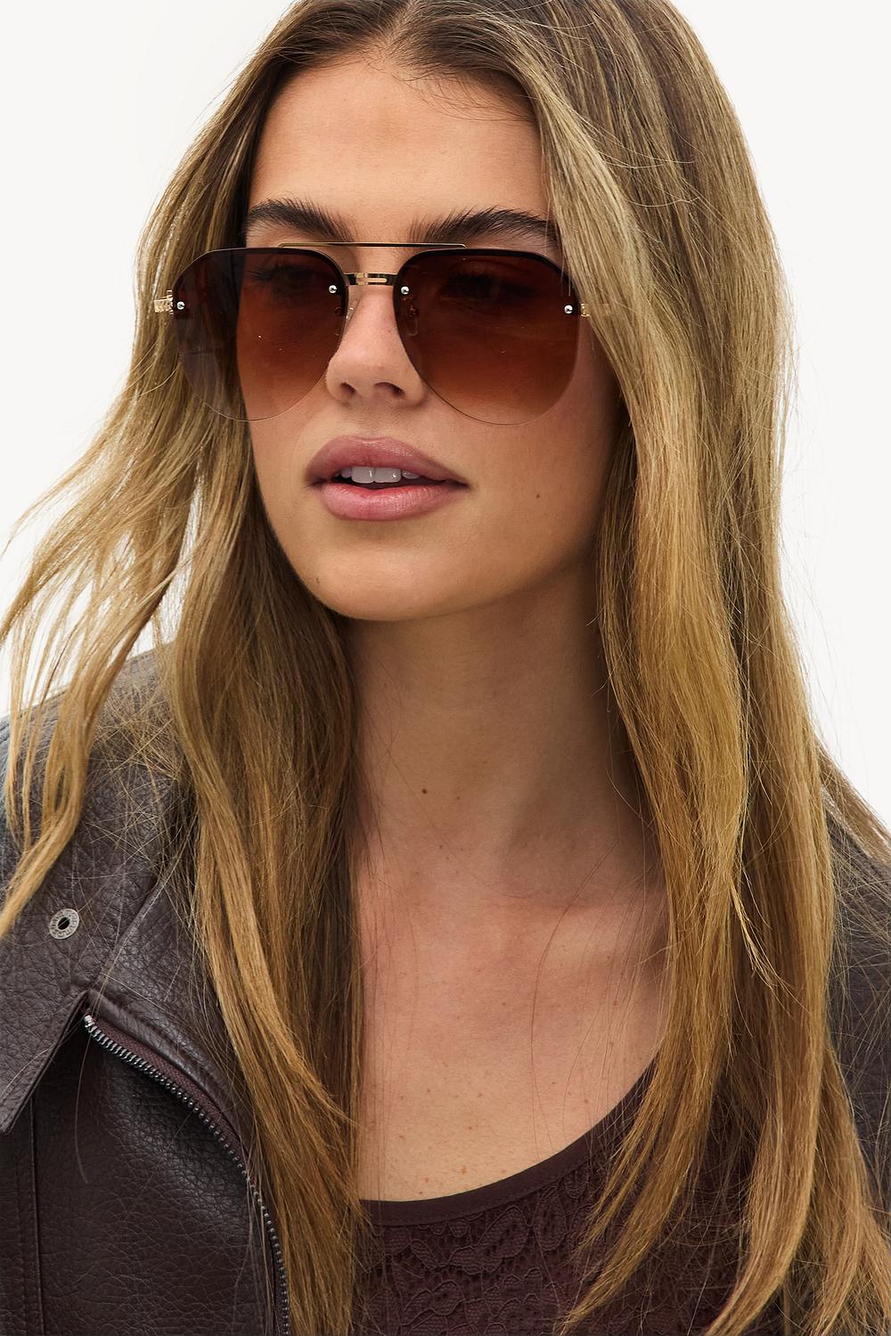 Brown aviator sunglasses EUR 16.99This pair of sunglasses features a classic design with brown gradient lenses and a gold-colored metal frame. The timeless aviator shape with subtle details creates a chic look that perfectly matches any outfit. The 100% metal construction ensures durability and comfort. Style these sunglasses with a leather jacket for a cool casual look.