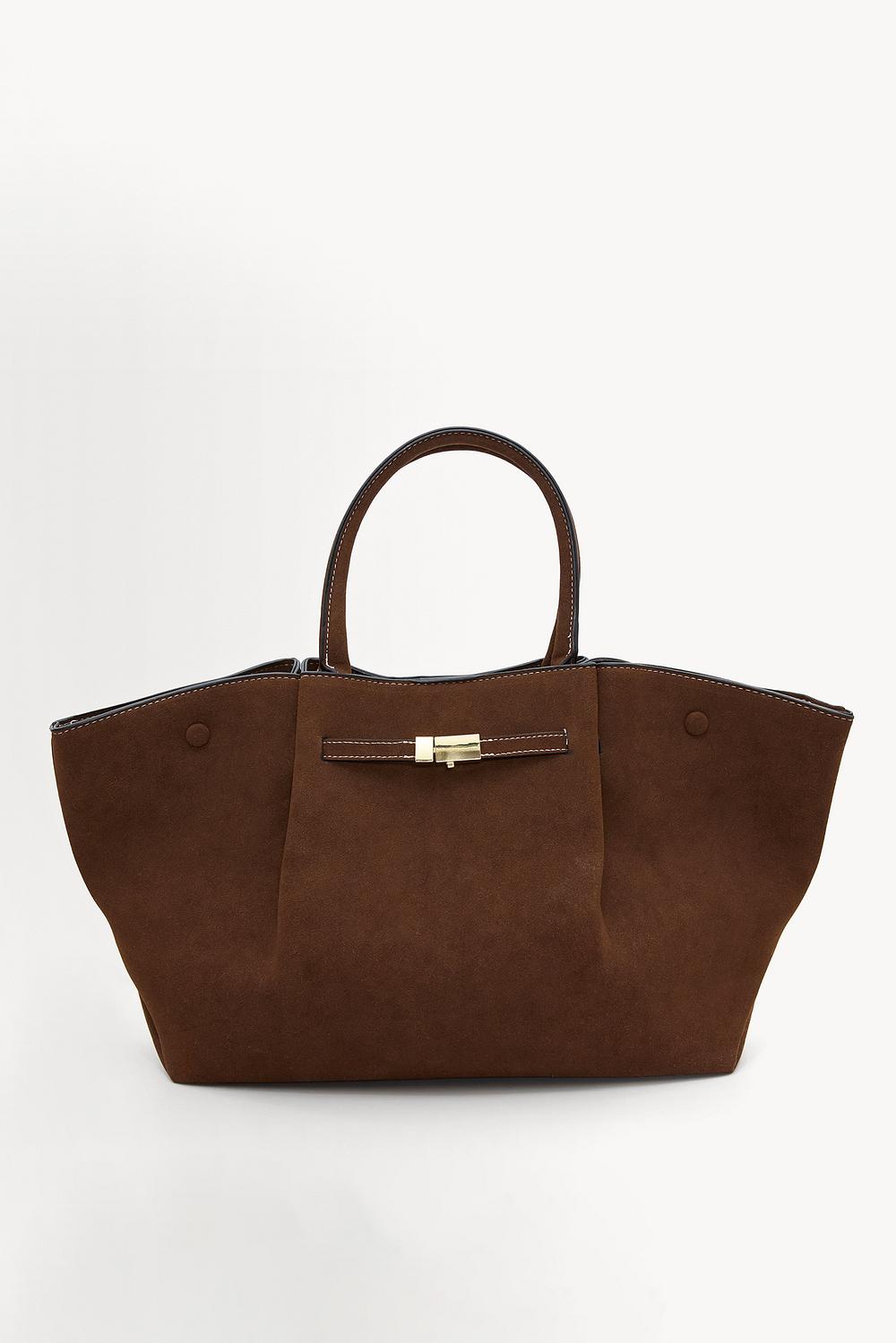 Brown bag EUR 49.99This dark brown suede-like tote bag features a luxurious textured design with gold hardware details. The spacious shape with short handles creates a chic look for any occasion. The minimalist design with statement closure gives this bag a modern twist. Style this tote with an oversized blazer for a sophisticated office look.