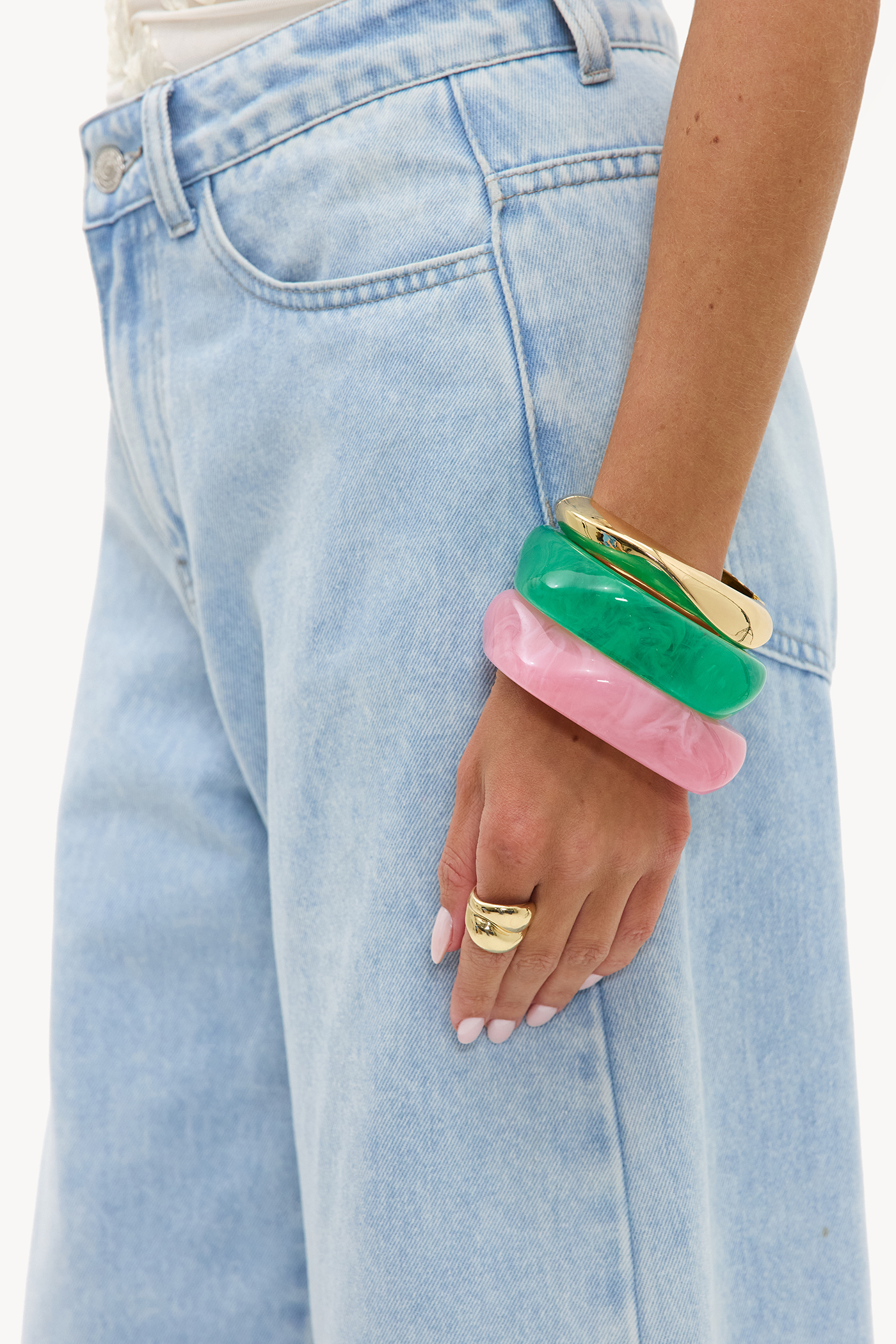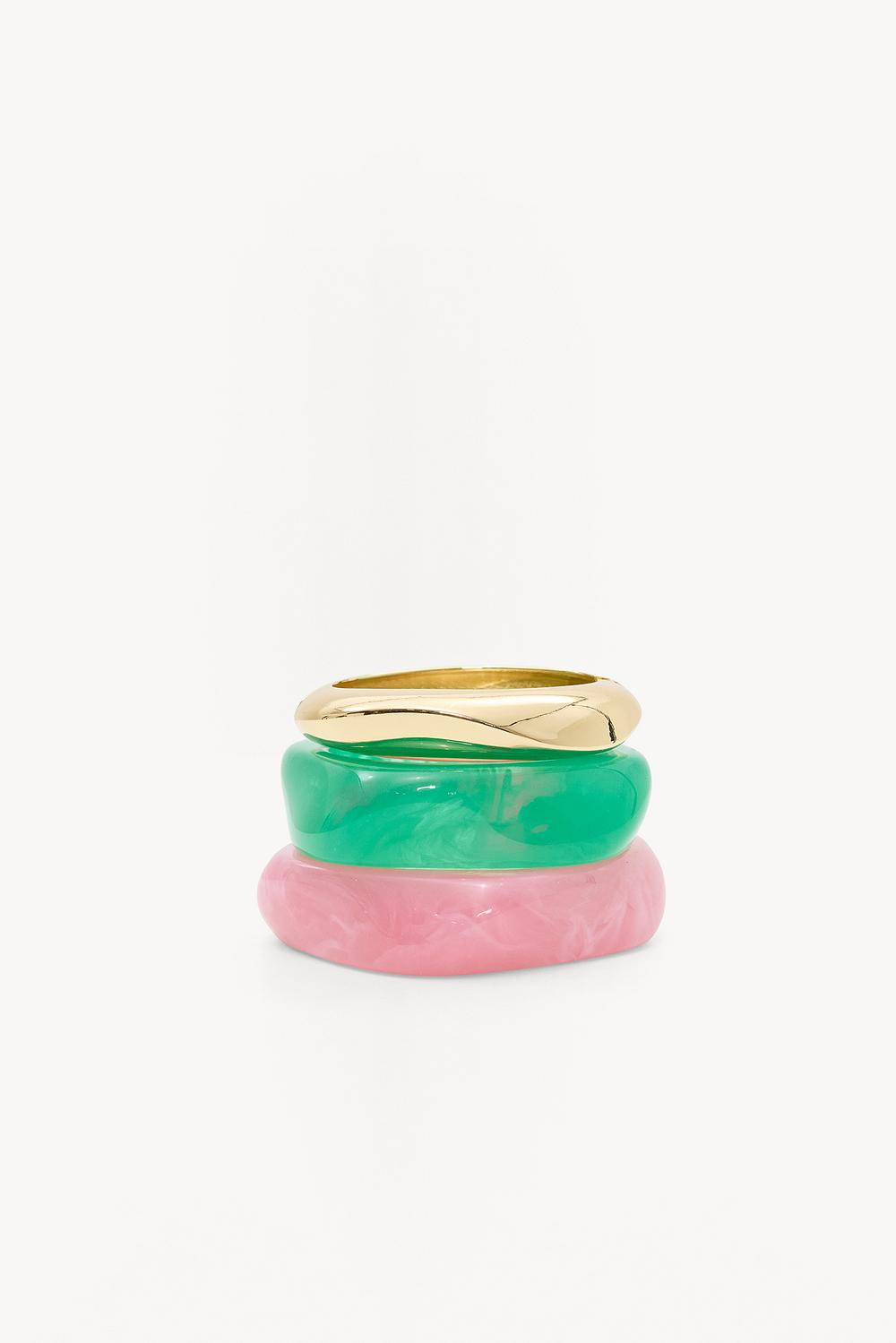 Bracelet set 3-pack EUR 24.99This statement bracelet set combines gold, green, and pink tones for a bold color blocking effect. The three different bracelets each have their own texture and shape, from smooth to marbled design. Stack them together for maximum impact or wear them separately for a subtle accent.
