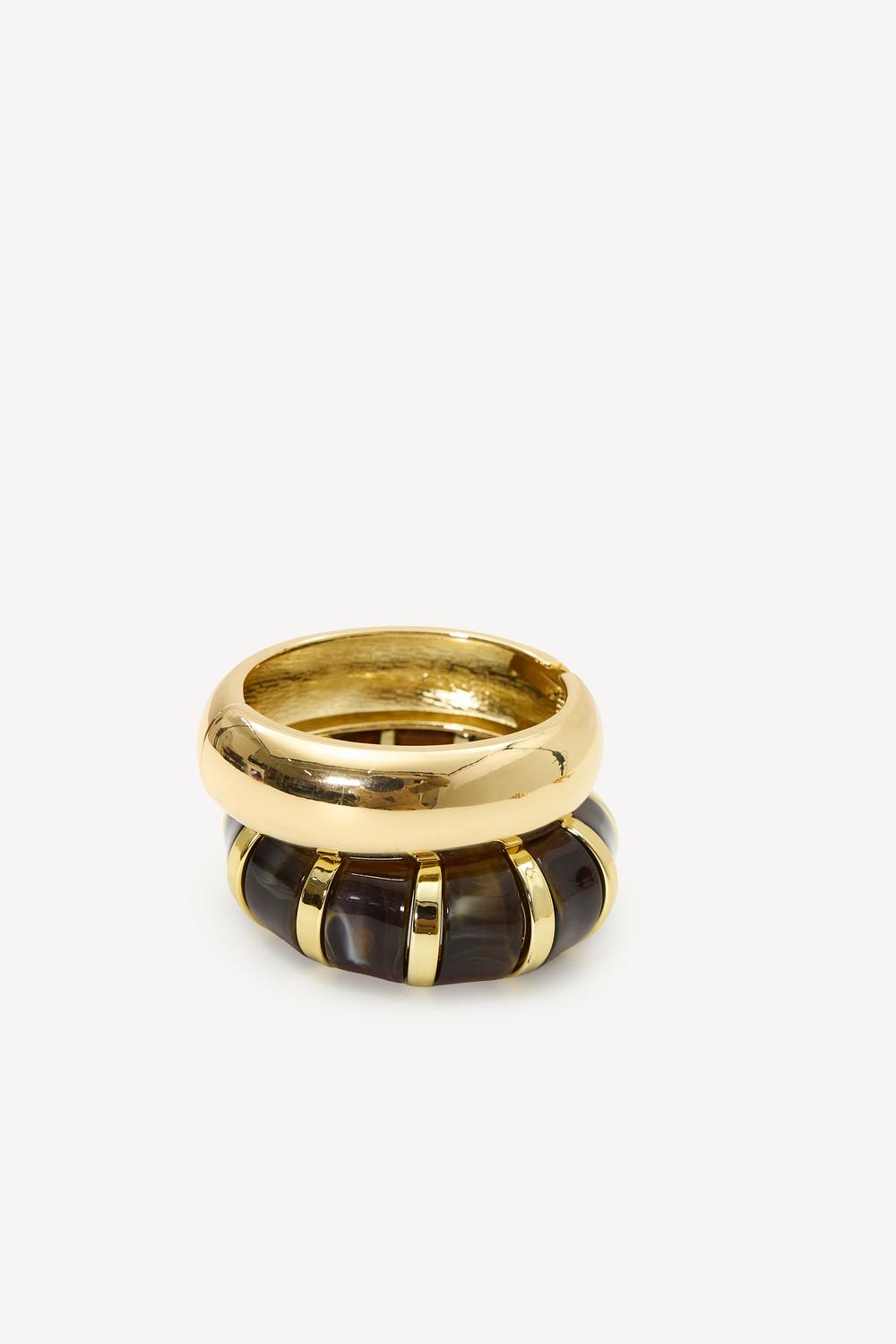 Gold bracelets 2-pack EUR 21.99This gold 2-pack bracelet set combines a classic bangle with a statement piece featuring black accents. The set consists of two bracelets that are perfect to wear together for a luxurious look. The gold-colored finish adds a chic touch to any outfit. Style this bracelet set with an off-shoulder top for an elegant dinner date or festival look.