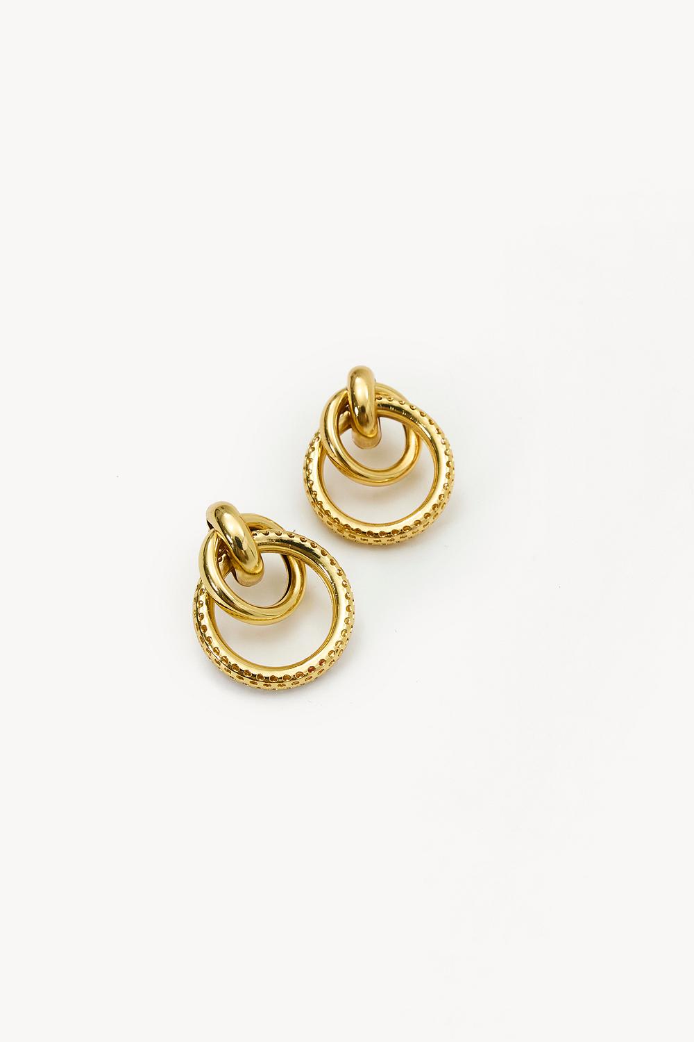 Gold earrings with double ring EUR 14.99These gold statement earrings feature a striking double hoop design with textured details. The twisted rope accents give these earrings a luxurious look. The high-quality stainless steel with gold plating ensures durability and a perfectly shiny finish. Style these earrings with a strapless top for a chic dinner date look.