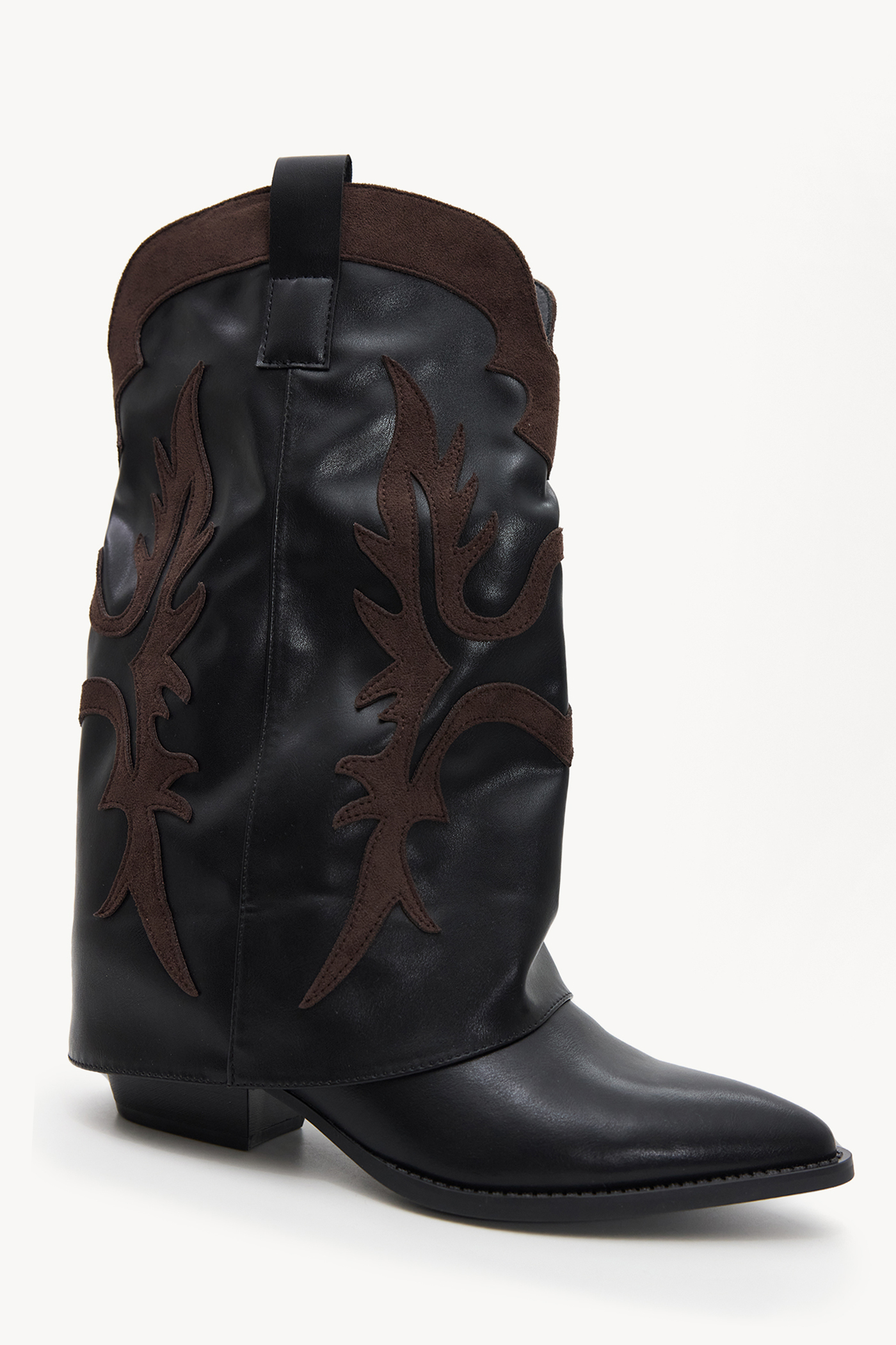 Black cowboy boots EUR 65.99These black cowboy boots feature striking brown flame details for an edgy western look. The pointed toe and classic cowboy silhouette give these boots an authentic appearance. The vegan leather finish provides a luxurious touch. Style these boots with wide-leg jeans and an oversized blazer for a cool contrast between western and modern.