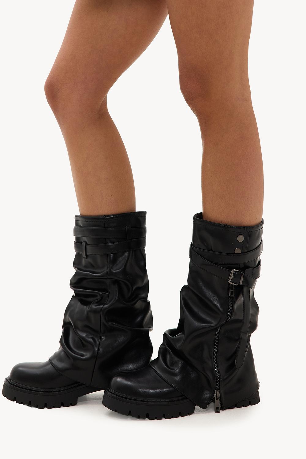 These black high boots feature a striking ruched design with statement buckle details for an edgy look. The high shaft with a slouchy fit and robust sole create a tough rock-chic appearance. The side zipper ensures easy on and off. Style these boots with a mini dress and oversized blazer for a cool contrast look.