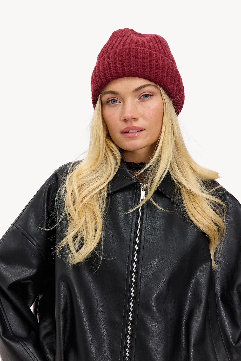 Este gorro acanalado burdeos tiene un ajuste clásico con un borde doblado. El diseño acanalado grueso le da a este gorro una textura genial y un aspecto casual. El cálido color burdeos hace que este gorro sea un accesorio perfecto para tus looks diarios.