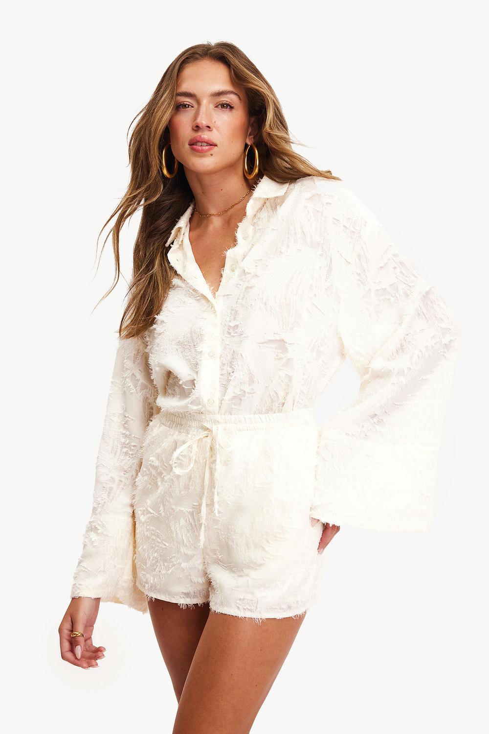Esta blusa presenta cuello, botones en la parte delantera, manga larga y un tejido jacquard con detalles suaves.