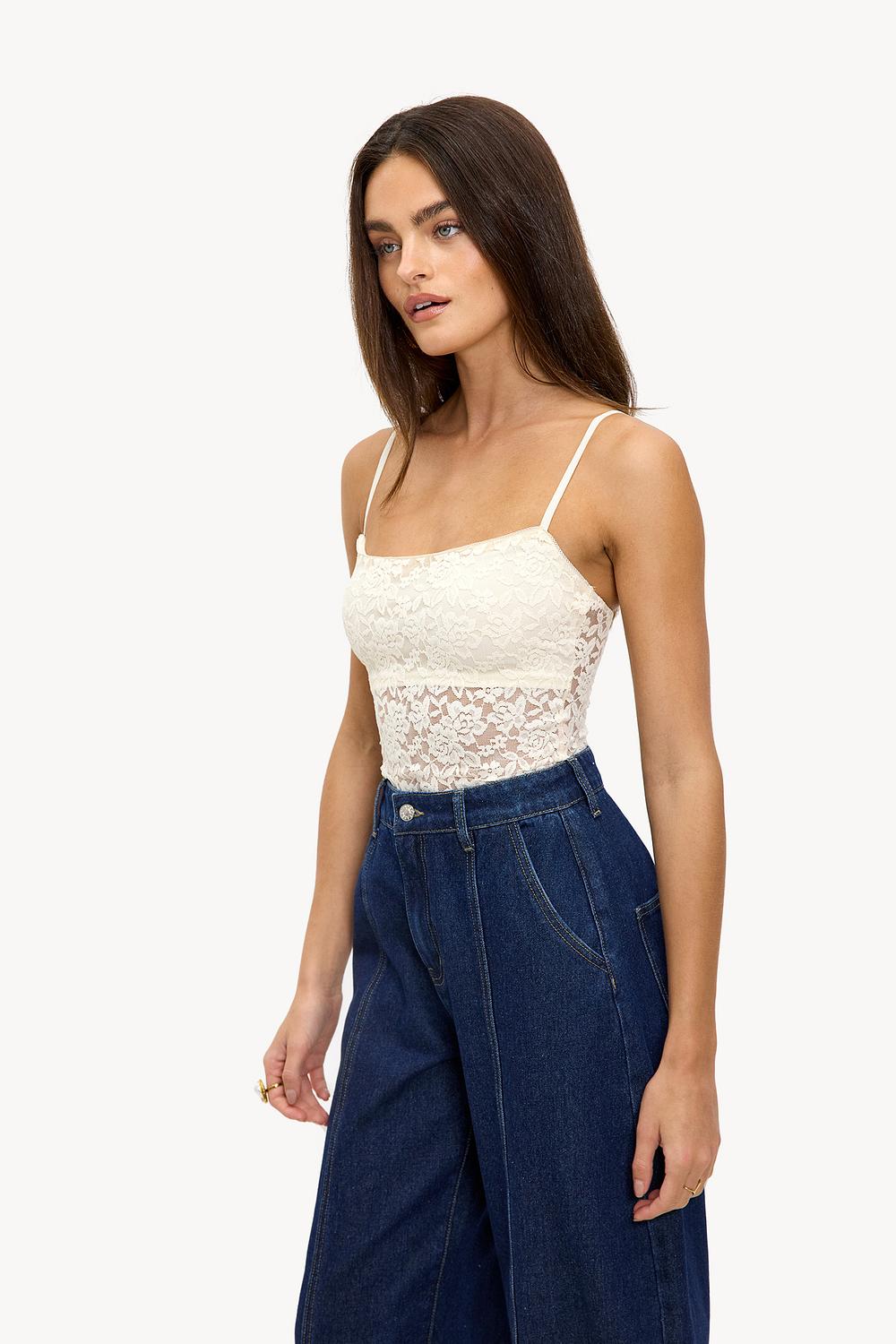 Este crop top blanco roto presenta un diseño de encaje lujoso con sutiles detalles florales. El escote corazón y los delicados tirantes finos crean un look femenino. El encaje semitransparente y el ajuste elástico proporcionan una actualización elegante al top clásico.