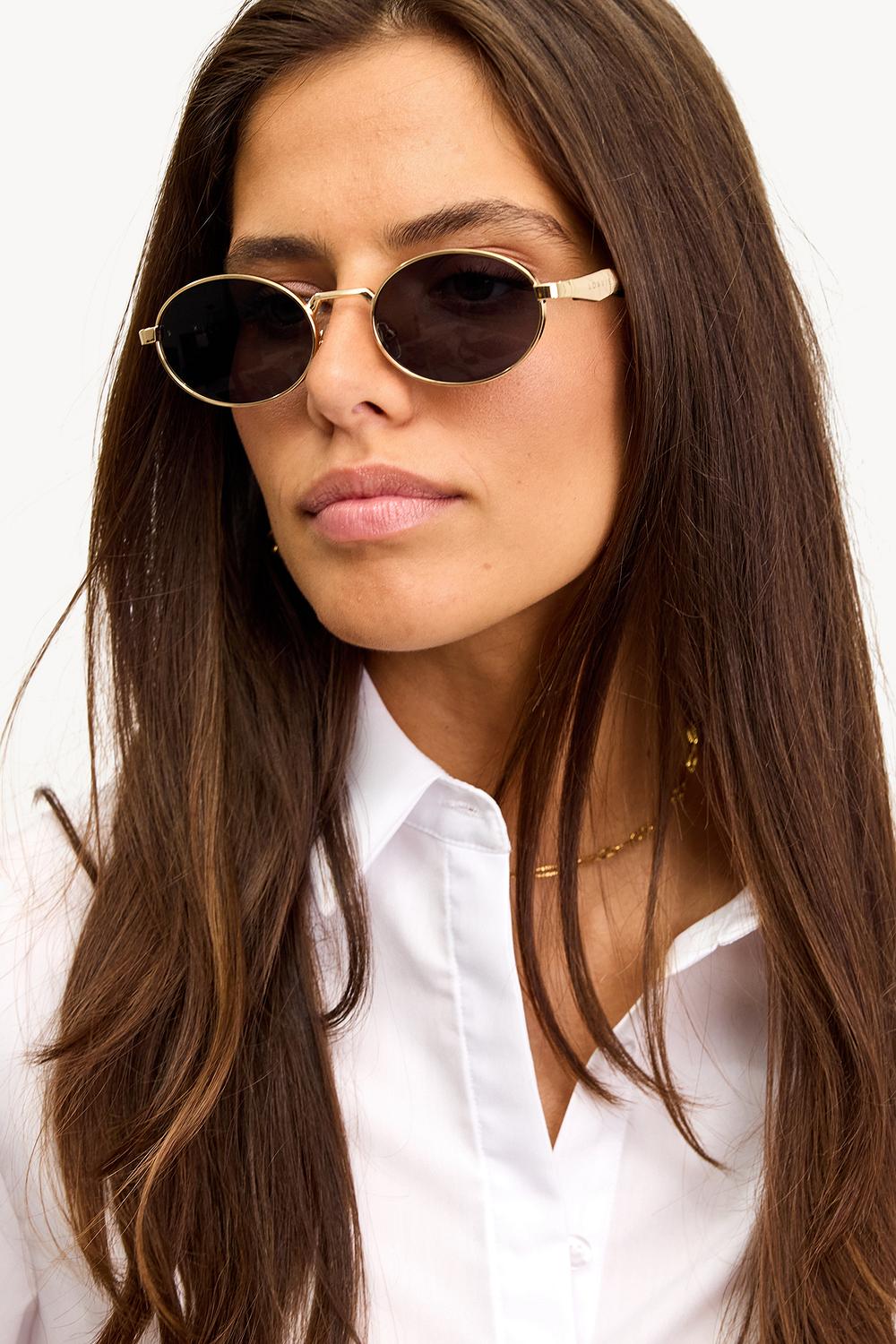 Gafas de sol con cristales negros y montura dorada. Estas gafas de sol se entregan con un estuche.