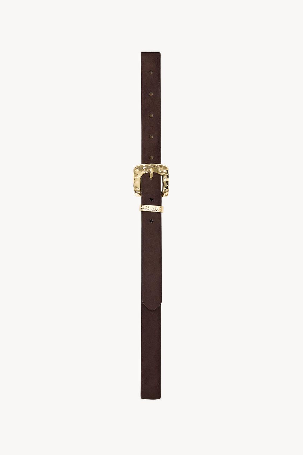 Este cinturón de estilo ante marrón oscuro cuenta con una hebilla dorada con detalles martillados. El ajuste clásico con cierre ajustable asegura un ajuste perfecto con cualquier atuendo. Combina este cinturón con una blusa oversize y jeans rectos para un look casual y chic.