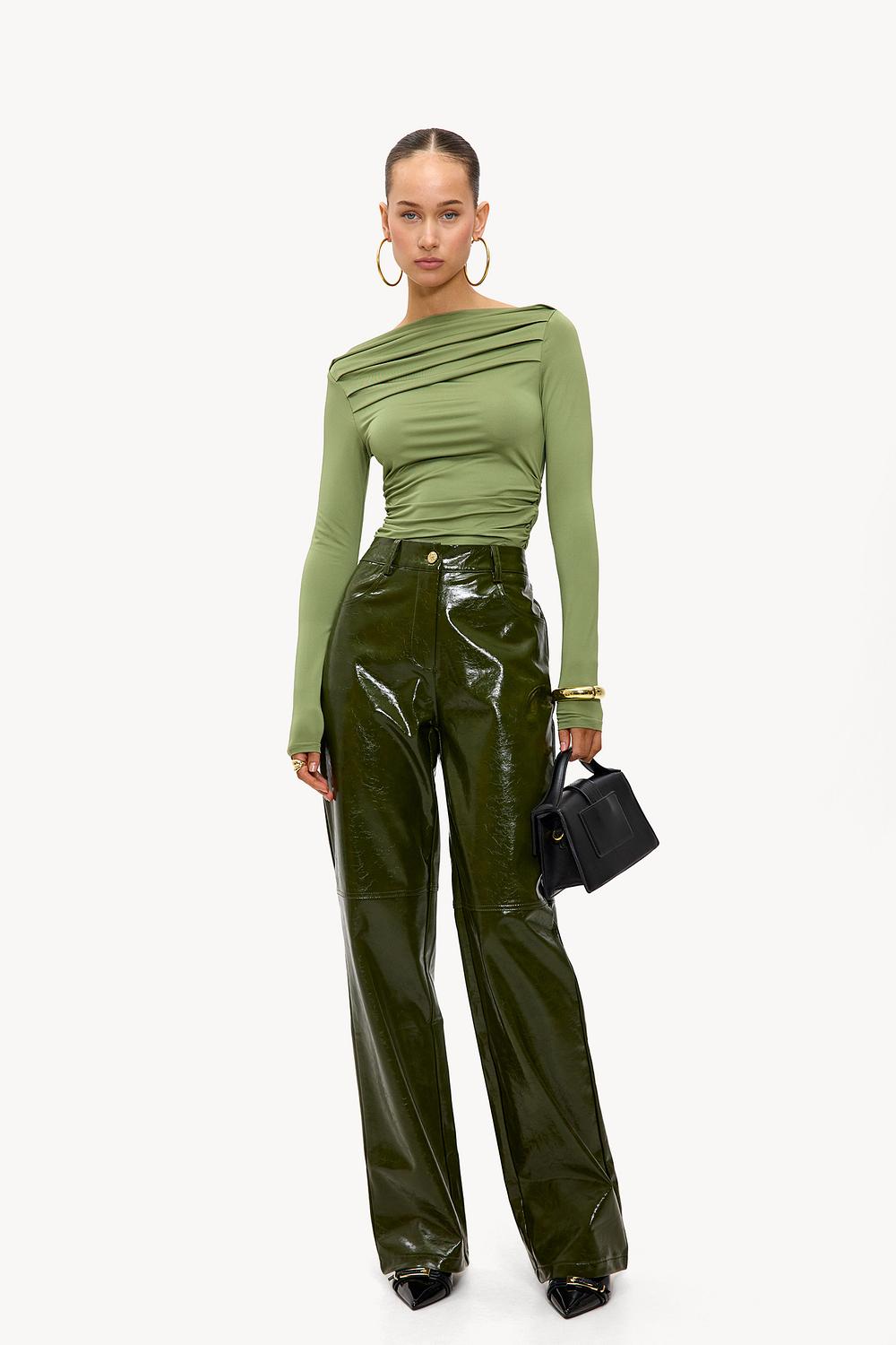 Este top de color salvia presenta un diseño drapeado lujoso con un escote de hombros descubiertos. El ajuste ceñido con detalles drapeados crea una forma elegante. Combina este top con pendientes llamativos para un look de cita para cenar elegante.