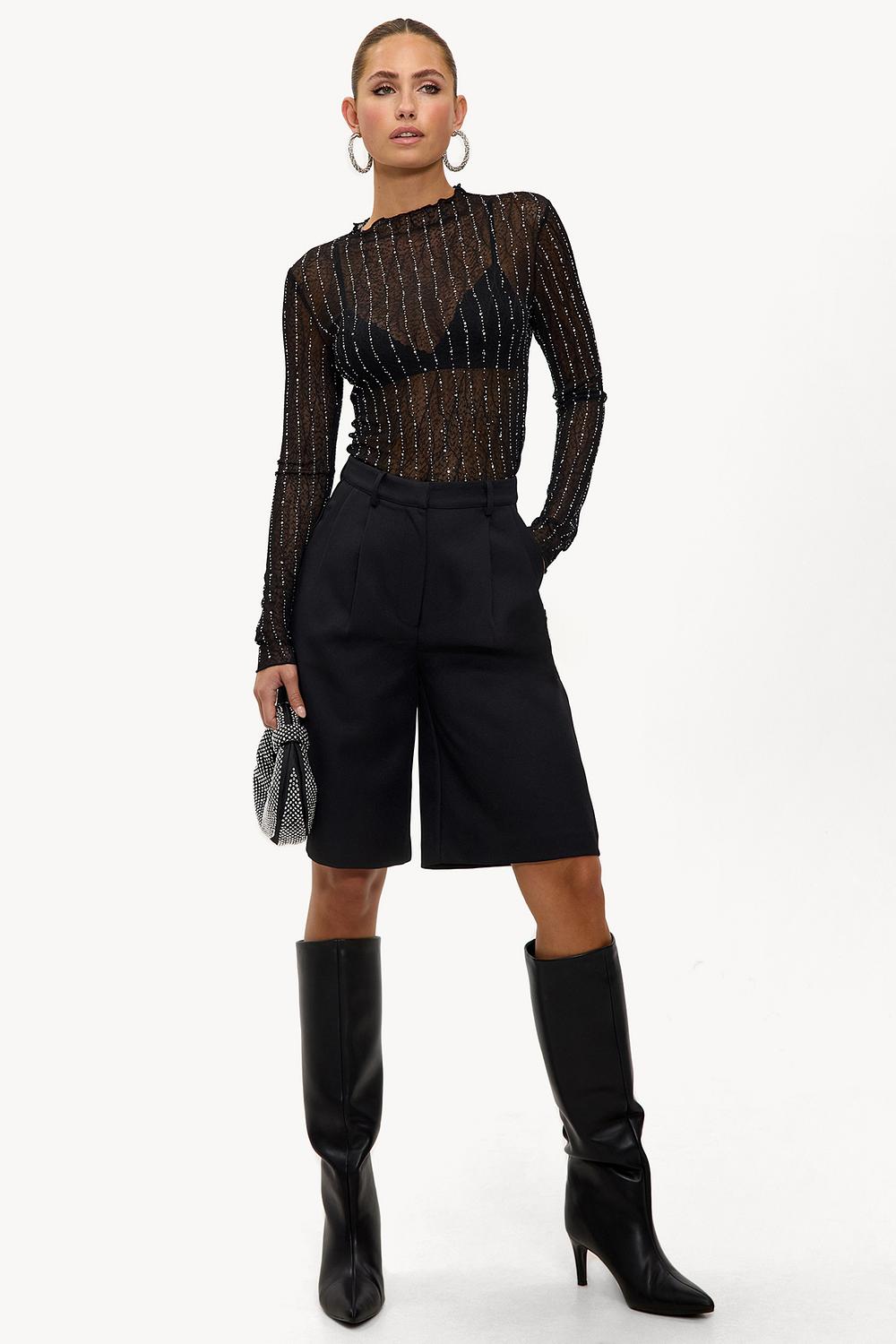 Pantalón corto negro 39,99 €Estos pantalones cortos negros de pierna ancha tienen un ajuste de cintura alta con detalles a medida para un look elegante. El ajuste relajado con pliegues sutiles y bolsillos le da a estos pantalones cortos una apariencia sofisticada. El largo midi crea un giro moderno al pantalón corto clásico. Combina estos pantalones cortos con un top llamativo y botas altas para un look de cita para cenar.