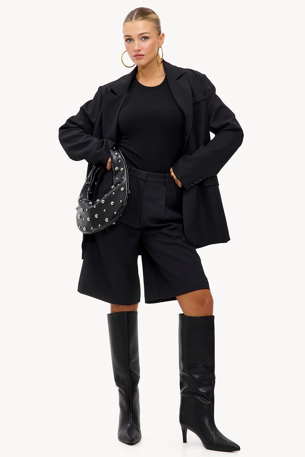 Estos pantalones cortos negros de pierna ancha tienen un ajuste de cintura alta con detalles a medida para un look elegante. El ajuste relajado con pliegues sutiles y bolsillos le da a estos pantalones cortos una apariencia sofisticada. El largo midi crea un giro moderno al pantalón corto clásico. Combina estos pantalones cortos con un top llamativo y botas altas para un look de cita para cenar.