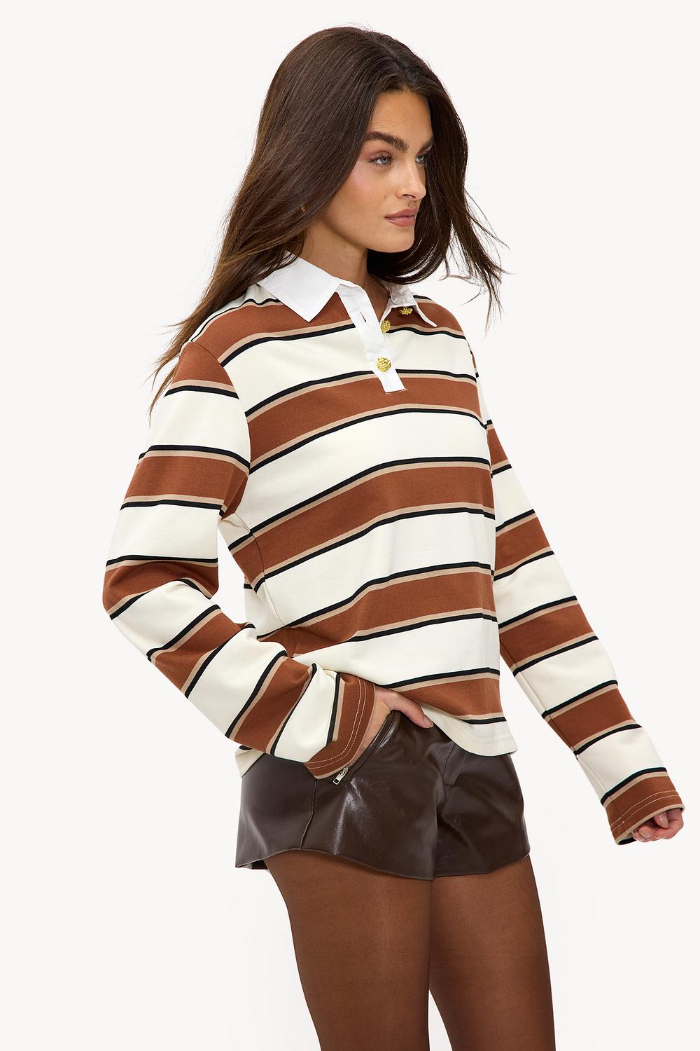 Este polo de manga larga a rayas presenta un diseño clásico inspirado en el rugby en tonos marrones. El ajuste oversize con cuello blanco y botones dorados le da un giro deportivo retro. La suave mezcla de algodón y poliéster garantiza comodidad y un aspecto relajado. Combina este polo con pantalones de pierna ancha para un look casual chic.