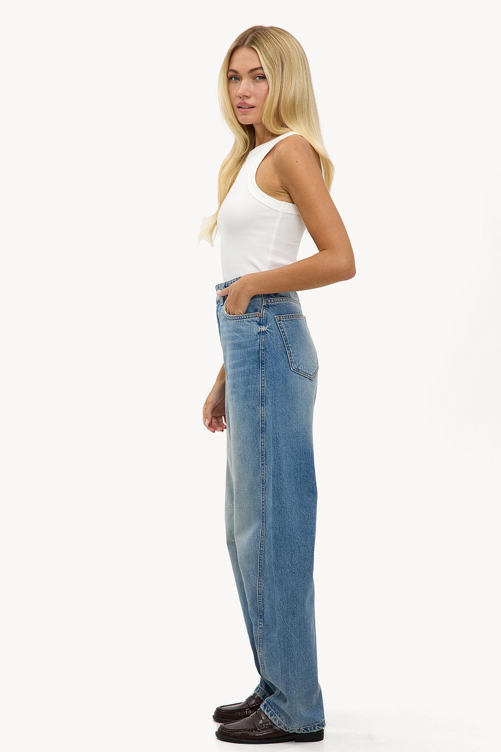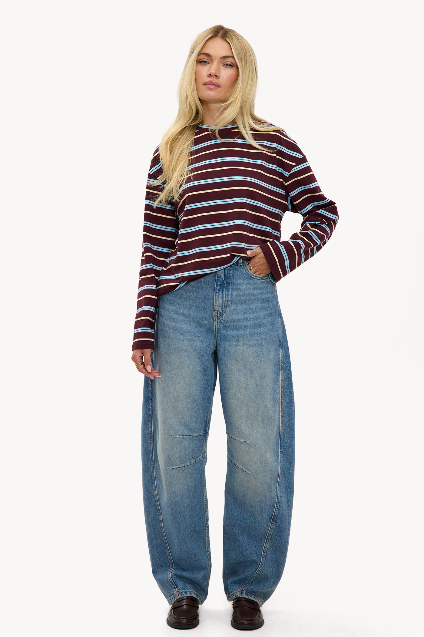 Estos jeans de ajuste globo de 5 bolsillos tienen un lavado vintage ligero y un ajuste de cintura alta. Las piernas anchas con detalles de desvanecimiento sutiles ofrecen un look de denim relajado. La calidad 100% algodón garantiza comodidad y una sensación de denim auténtica. Combina estos jeans con un suéter corto para un look casual chic.