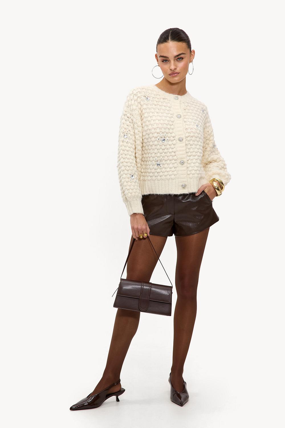 Esta chaqueta de punto color crudo presenta un diseño de tejido texturizado lujoso con botones llamativos para un toque chic. El cierre clásico de botones y los detalles acanalados le dan a esta prenda de punto un aspecto atemporal. La suave mezcla de poliamida, poliéster y acrílico garantiza comodidad y durabilidad. Combina esta chaqueta con shorts de efecto cuero para un look de contraste fresco.