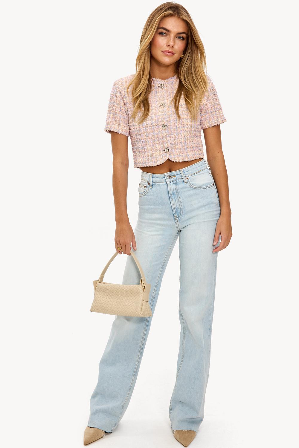 Esta chaqueta corta rosa claro presenta una textura de bouclé lujosa con detalles sutiles en colores pastel. Las mangas cortas y los botones llamativos dan un giro moderno al diseño clásico. El corte corto crea un look elegante para un almuerzo o un día de oficina.