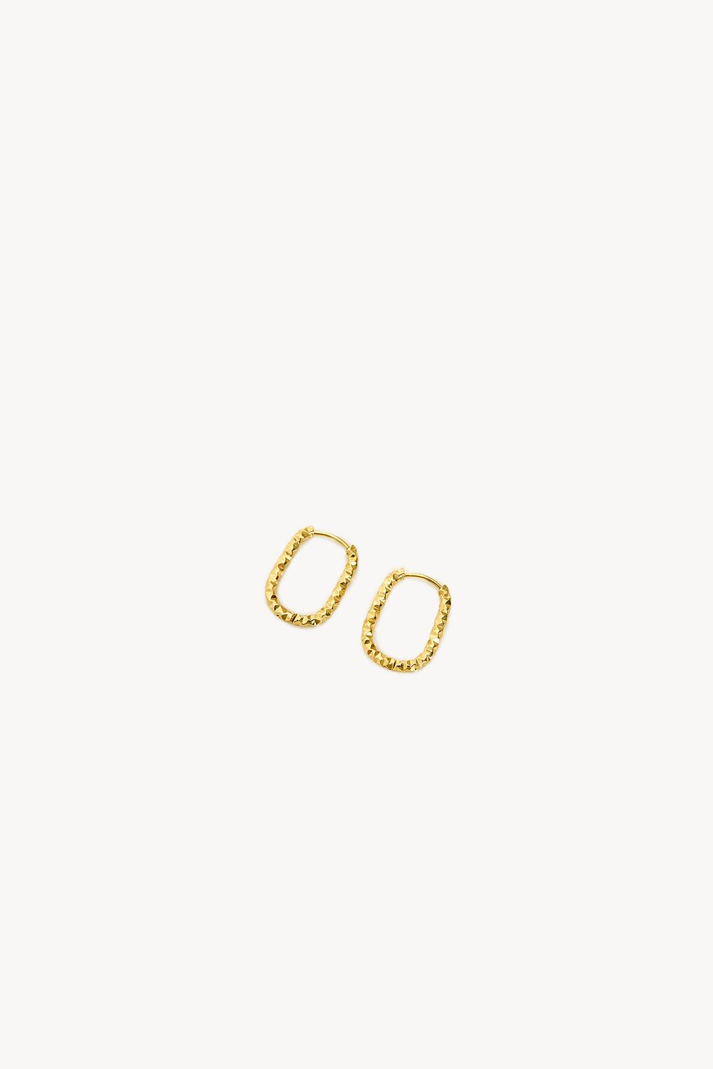 Estos pendientes de aro dorados presentan un diseño texturizado llamativo con detalles sutiles alrededor. La forma ovalada compacta crea un giro moderno en el clásico pendiente de aro. El acero inoxidable de alta calidad con baño de oro proporciona un aspecto lujoso que complementa perfectamente tanto los atuendos casuales como los elegantes.