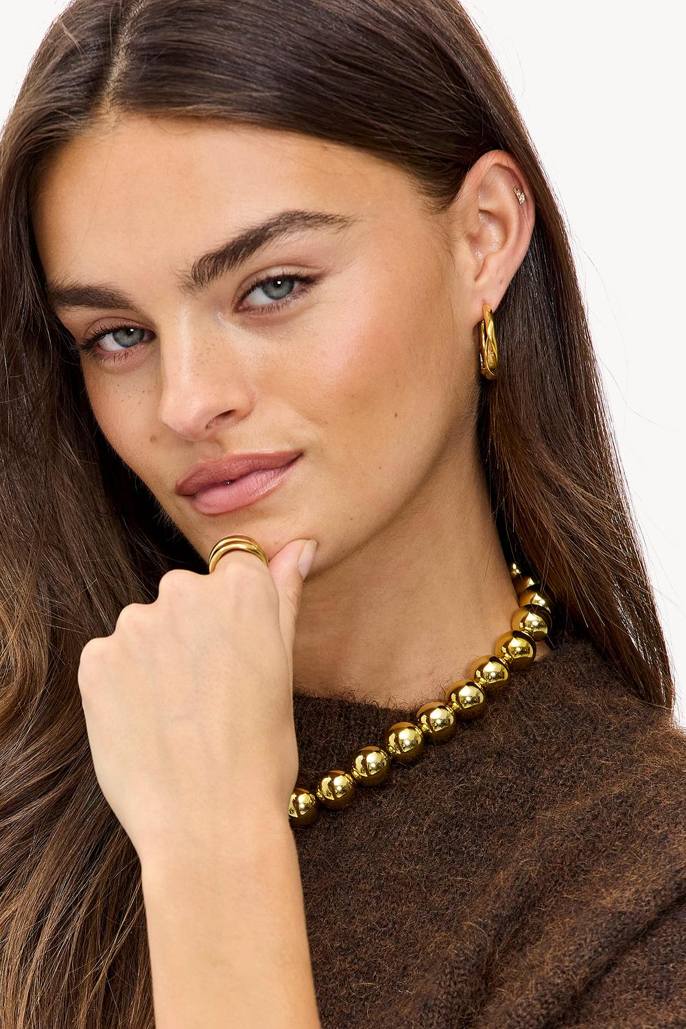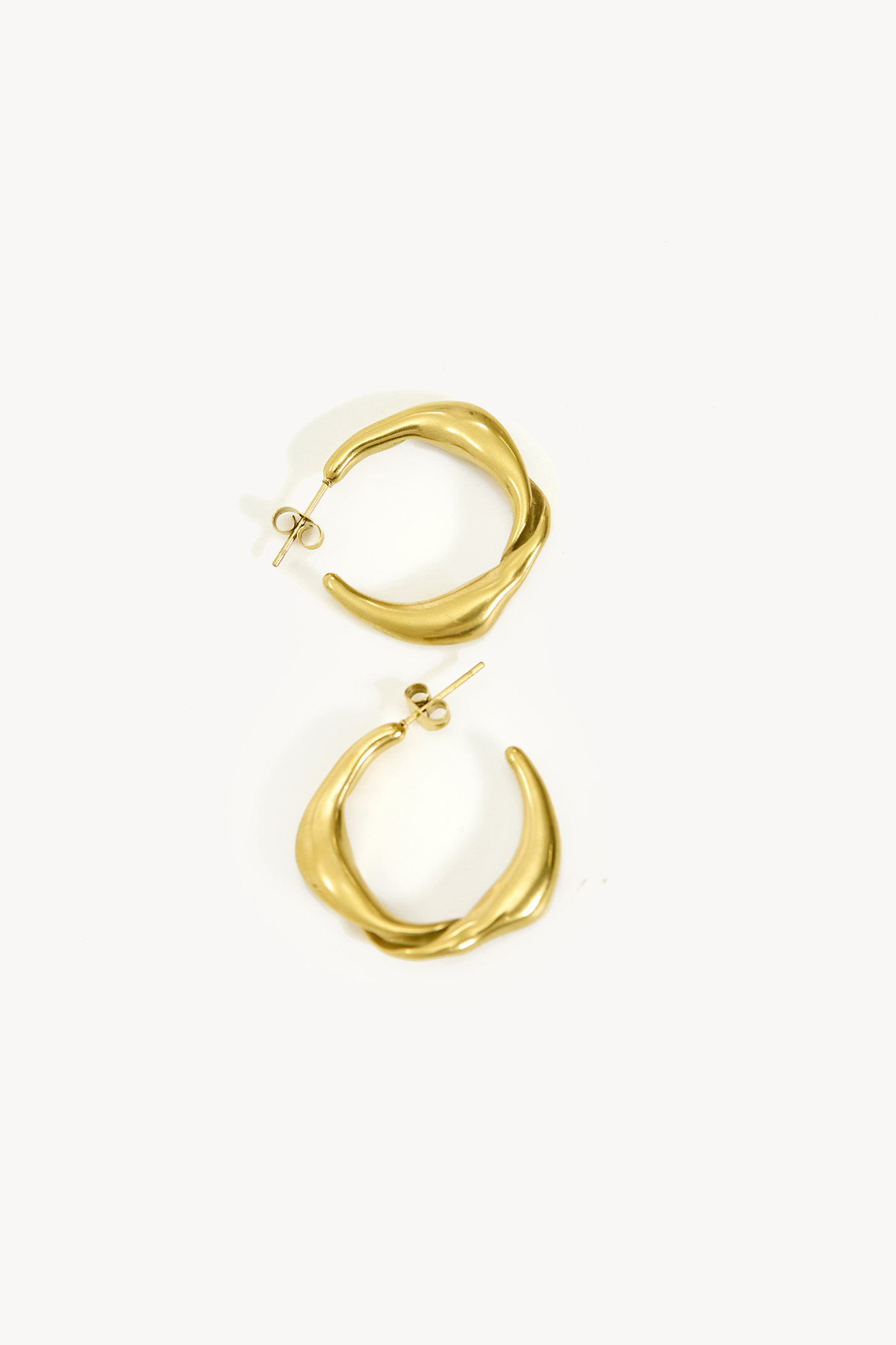 Estos pendientes de aro dorados retorcidos presentan un diseño retorcido llamativo para un look lujoso. Los aros gruesos con textura sutil añaden un giro de declaración a tu atuendo. El acero inoxidable de alta calidad con baño de oro garantiza durabilidad y un acabado perfectamente brillante. Combina estos aros con un collar de oro para un look completo de golden hour.