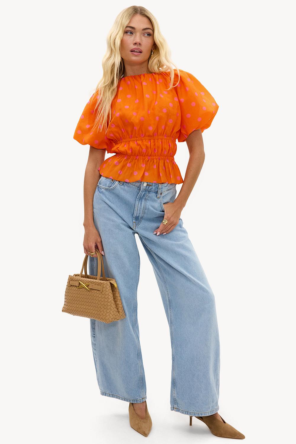 Esta blusa naranja presenta un llamativo estampado de lunares con puntos rosas para un look llamativo. Las mangas abullonadas y la cintura elástica con volantes crean una forma femenina. El ajuste corto con detalles fruncidos le da a este top un giro moderno. Combina esta blusa con unos jeans de pierna ancha para el atuendo perfecto del Día del Rey.