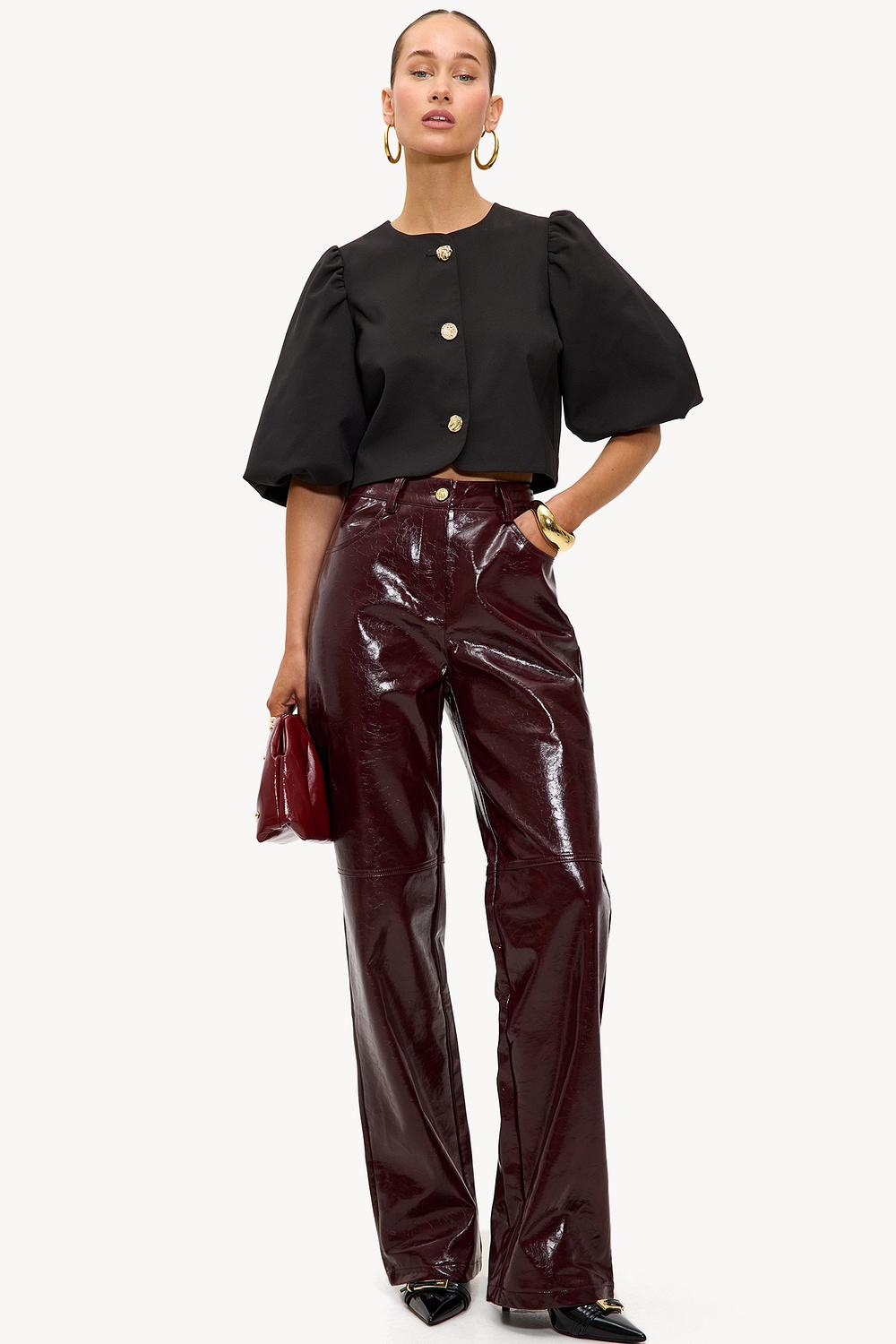 Esta blusa negra recortada presenta mangas abullonadas llamativas y detalles de botones dorados para un toque chic. El ajuste corto con hombros sutilmente abullonados crea un look moderno que complementa perfectamente la forma. Combina esta blusa con unos vaqueros de cintura alta para un conjunto casual y elegante.