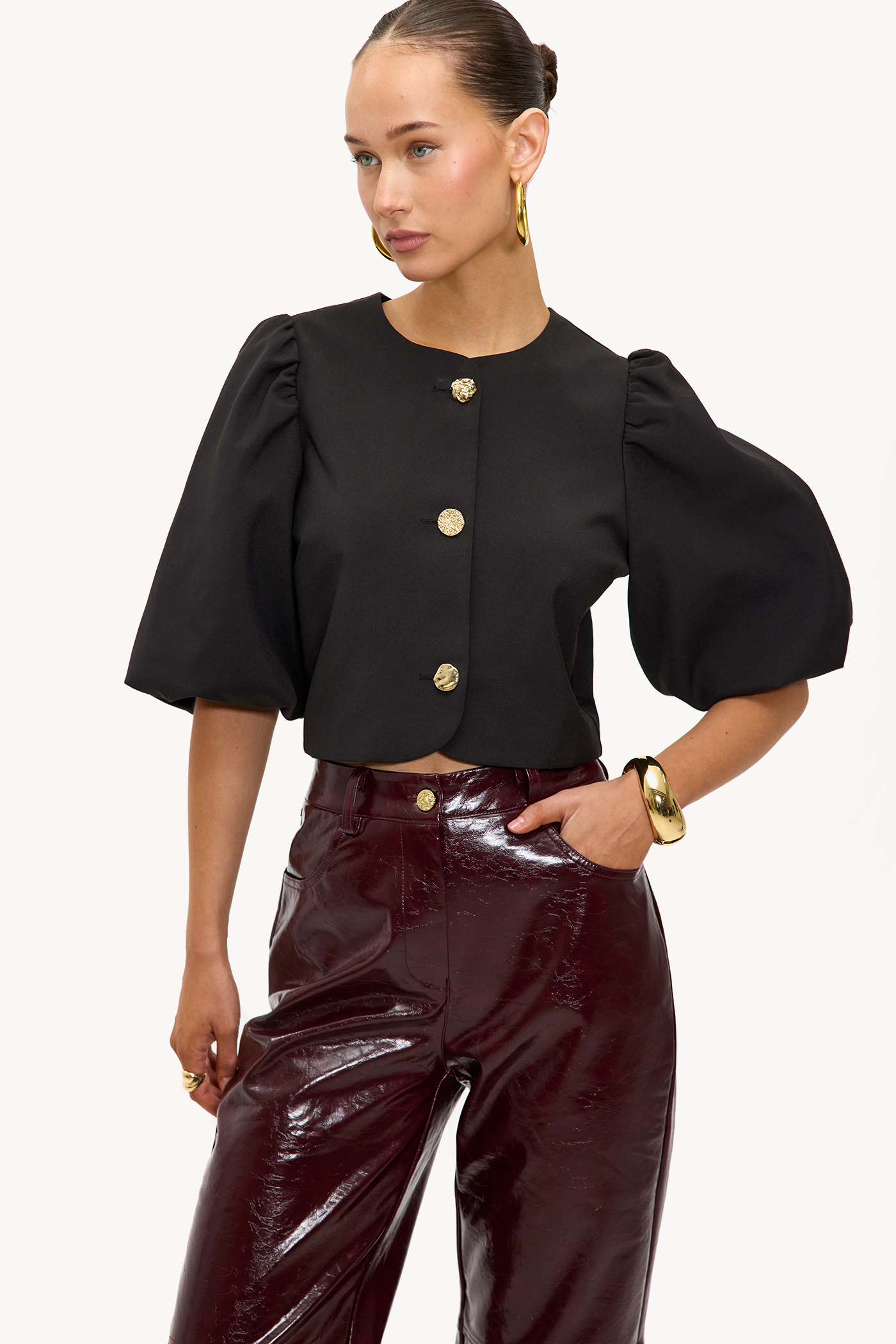 Esta blusa negra recortada presenta mangas abullonadas llamativas y detalles de botones dorados para un toque chic. El ajuste corto con hombros sutilmente abullonados crea un look moderno que complementa perfectamente la forma. Combina esta blusa con unos vaqueros de cintura alta para un conjunto casual y elegante.