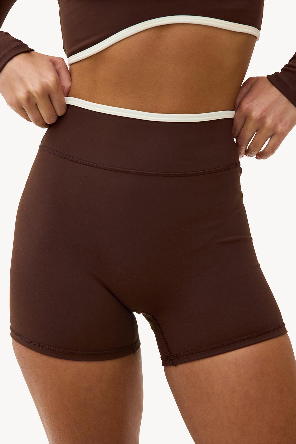 Estos shorts deportivos marrón oscuro con un ajuste de cintura alta y un sutil ribete blanco de contraste acentúan tu forma de manera deportiva. El ajuste ceñido y el material elástico aseguran una libertad de movimiento óptima durante pilates, yoga, fitness, correr, descansar o una carrera de café. Úsalos con el crop top a juego para un conjunto completo o mezcla & combina para tus vibras estéticas favoritas.