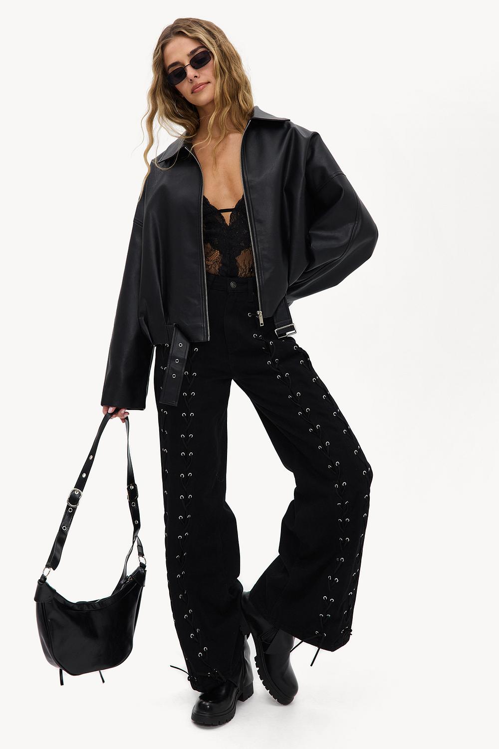 Esta chaqueta de motociclista de aspecto cuero negro tiene un ajuste oversize con mangas abullonadas para un look atrevido. El frente con cremallera y cuello clásico y las costuras contrastantes sutiles le dan a esta chaqueta una apariencia rock-chic. El ajuste relajado crea un giro fresco en el diseño atemporal del motociclista. Combina esta chaqueta con jeans anchos negros y botas para un look completo inspirado en festivales.