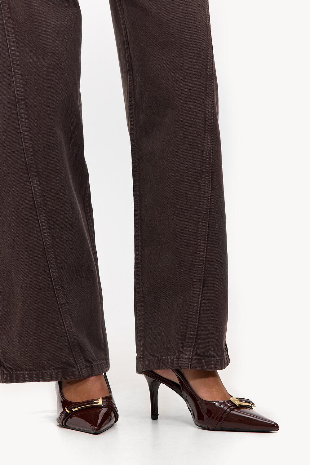 Estos zapatos de salón slingback puntiagudos marrones tienen un acabado de charol lujoso con herrajes dorados llamativos. La punta puntiaguda y la correa slingback elegante crean un aspecto sofisticado. El tacón medio asegura comodidad y una apariencia chic para días de oficina o citas para cenar.