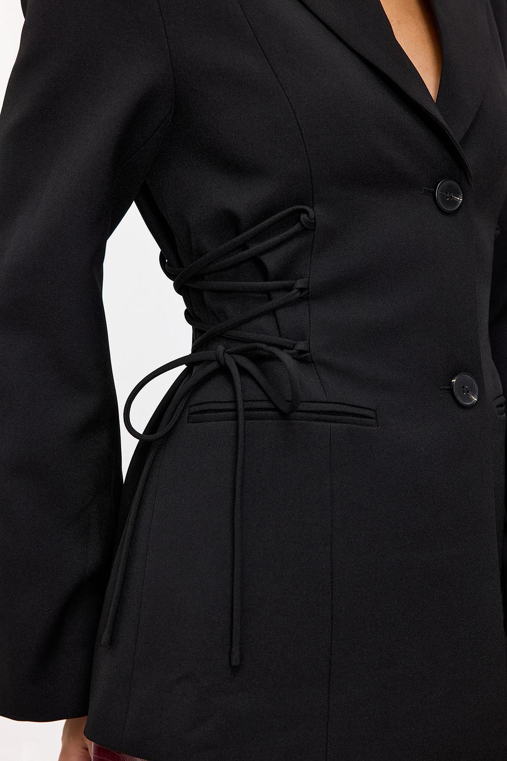 Este blazer negro presenta llamativos detalles de cordones en los laterales para un giro moderno en el diseño clásico. El ajuste entallado con cierre de doble botón crea un look elegante. Los detalles de lazo añaden un toque femenino adicional y acentúan la forma de una manera genial. Combina este blazer con pantalones de aspecto de cuero para un look de oficina impactante.