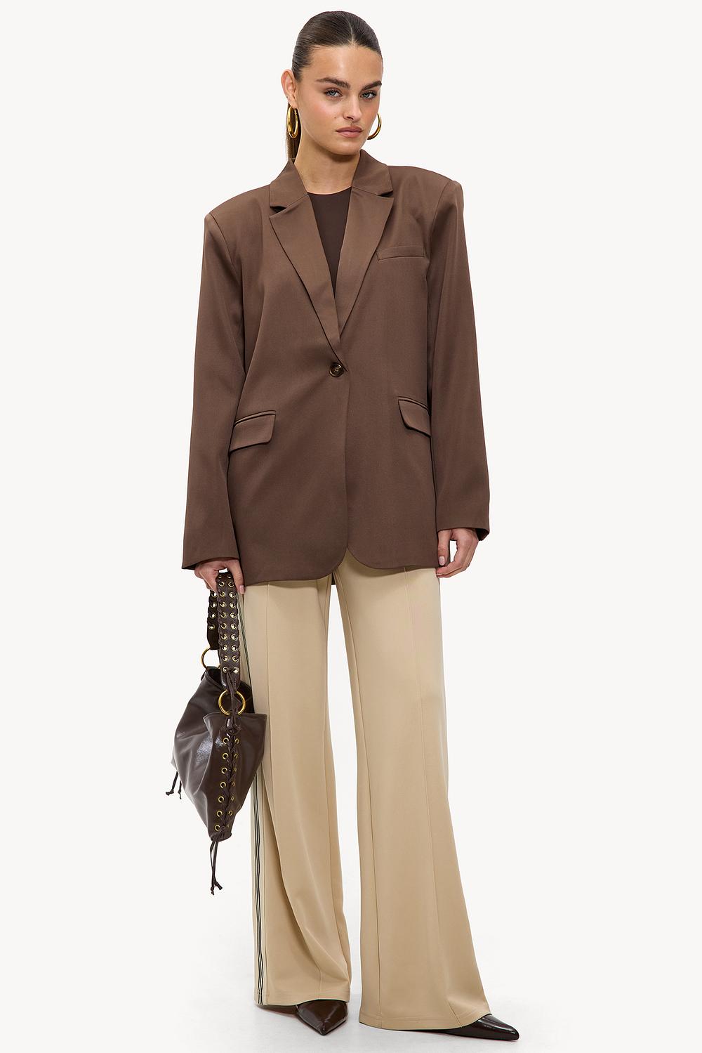 Esta blazer oversize marrón oscuro presenta un detalle de corte audaz en la espalda para un giro moderno. El ajuste entallado con solapas clásicas y bolsillos crea un look elegante. El ajuste oversize le da a este blazer una actualización contemporánea del diseño clásico. Combina este blazer con pantalones de pierna ancha para un look de oficina sofisticado.
