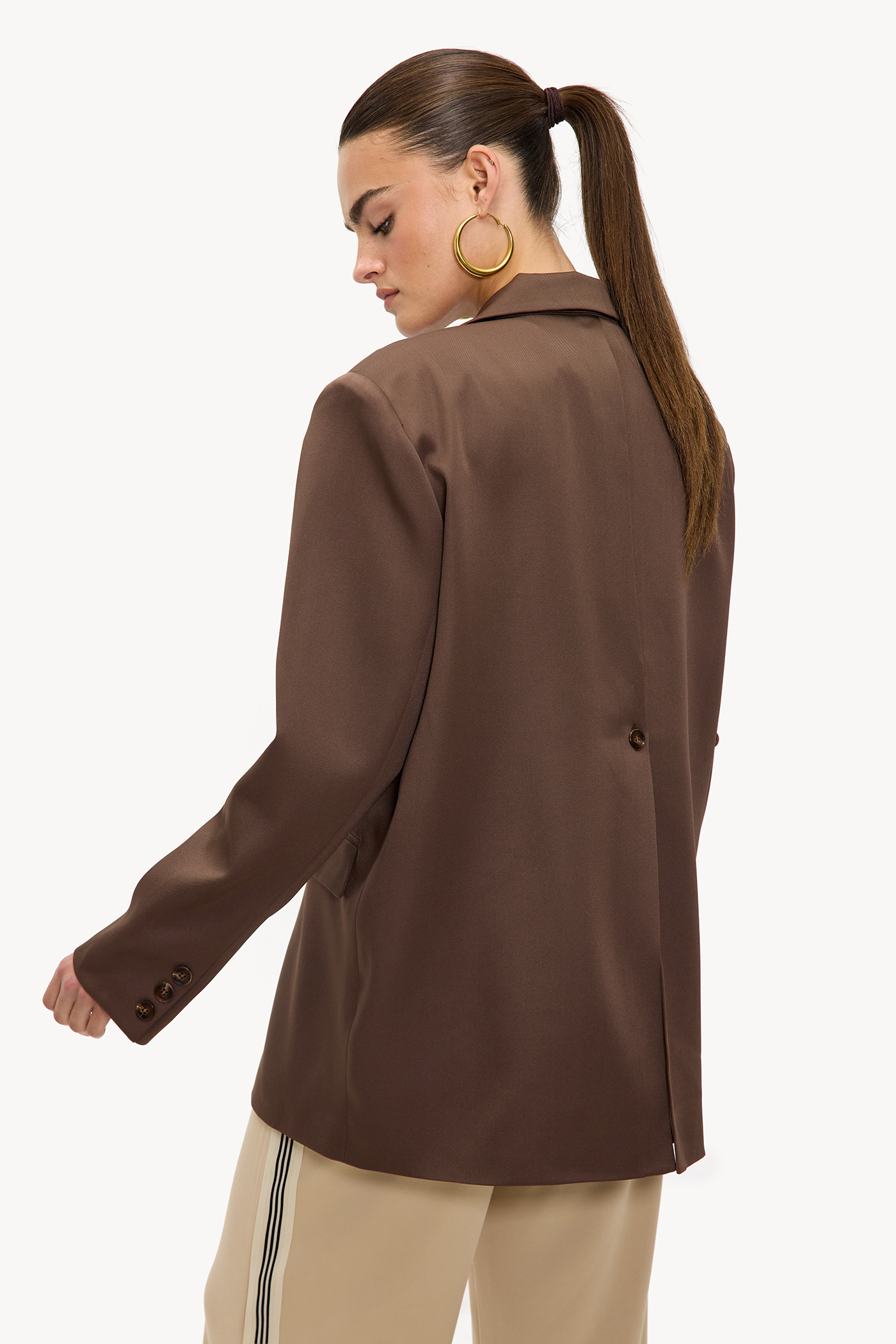 Esta blazer oversize marrón oscuro presenta un detalle de corte audaz en la espalda para un giro moderno. El ajuste entallado con solapas clásicas y bolsillos crea un look elegante. El ajuste oversize le da a este blazer una actualización contemporánea del diseño clásico. Combina este blazer con pantalones de pierna ancha para un look de oficina sofisticado.