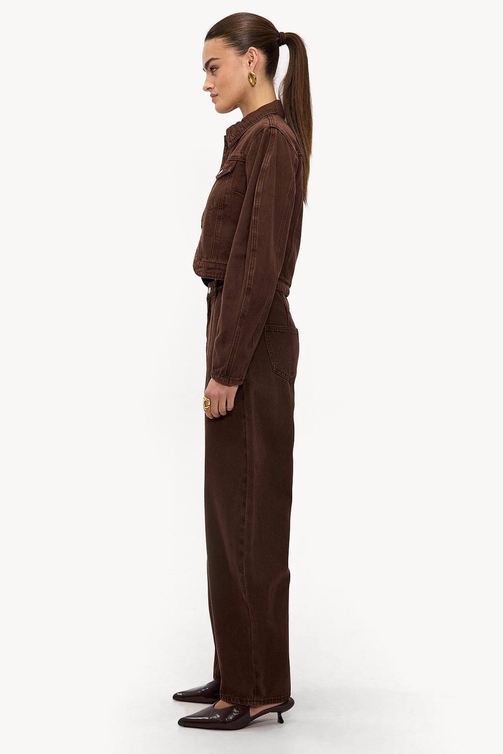 Estos jeans de globo de pierna ancha en marrón oscuro presentan un ajuste de cintura alta con costuras contrastantes llamativas. Las piernas estilo globo con parte inferior cónica crean un giro moderno al diseño clásico de mezclilla. La suave calidad del algodón asegura comodidad y una apariencia lujosa. Combina estos jeans con la chaqueta de mezclilla a juego para un look de mezclilla sobre mezclilla impactante.