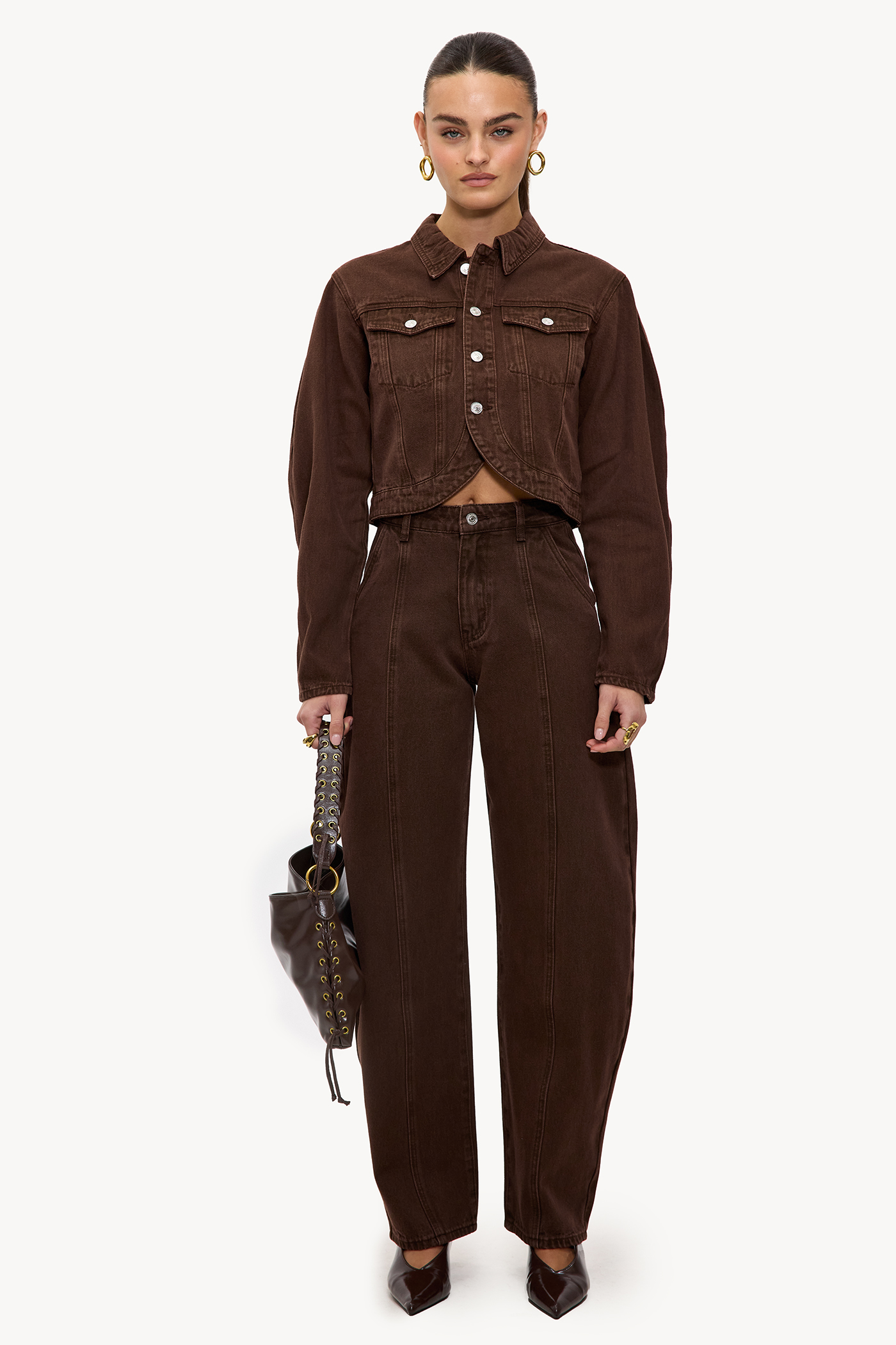 Estos jeans de globo de pierna ancha en marrón oscuro presentan un ajuste de cintura alta con costuras contrastantes llamativas. Las piernas estilo globo con parte inferior cónica crean un giro moderno al diseño clásico de mezclilla. La suave calidad del algodón asegura comodidad y una apariencia lujosa. Combina estos jeans con la chaqueta de mezclilla a juego para un look de mezclilla sobre mezclilla impactante.