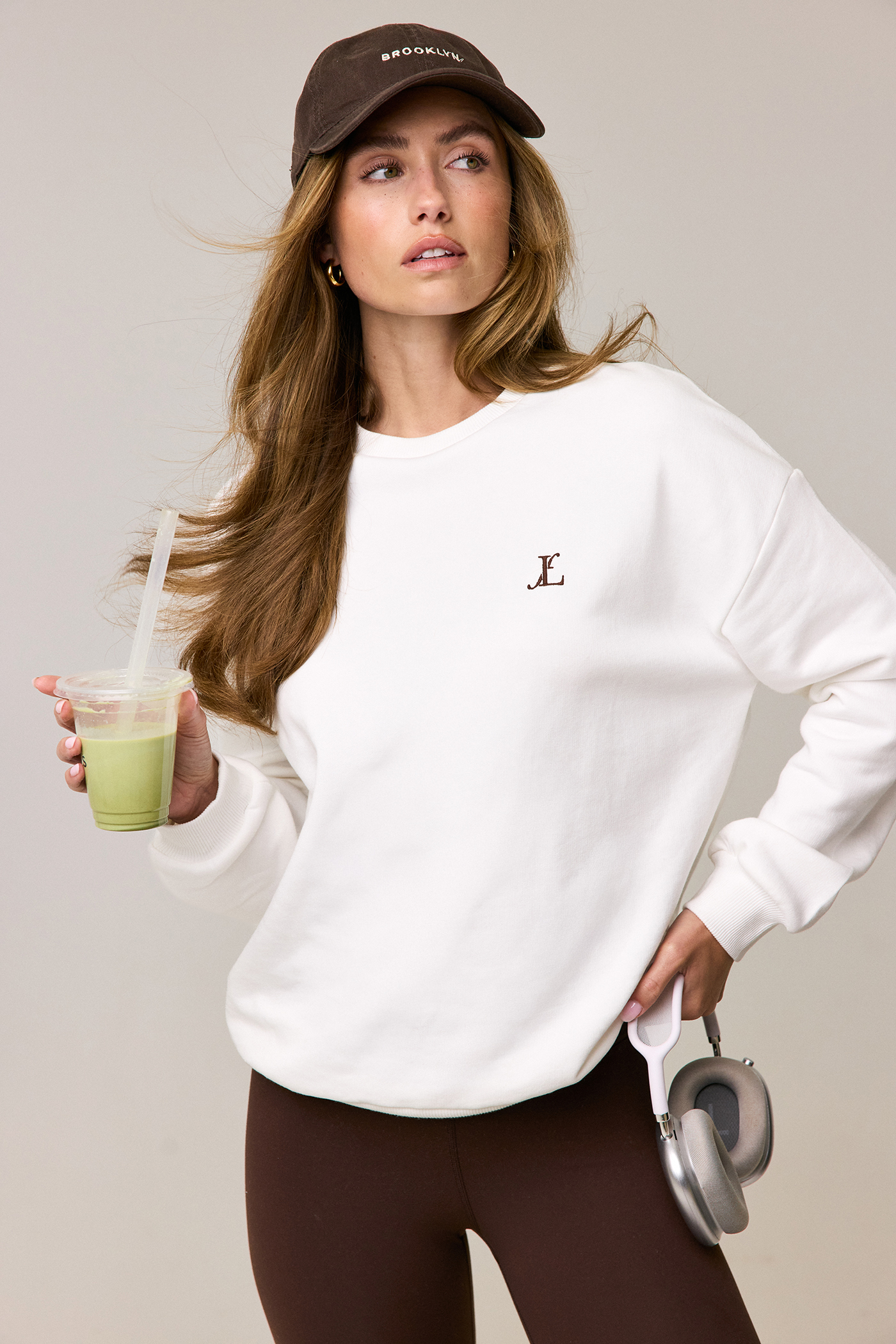 Este suéter oversize blanco roto presenta un sutil detalle de logo bordado en el pecho para un look minimalista. El ajuste relajado con puños acanalados crea una apariencia casual y cómoda. La mezcla de algodón suave asegura un confort óptimo durante tus actividades diarias. El artículo es divertido de combinar con tu conjunto deportivo favorito para el ambiente perfecto de Pilates. Estiliza este suéter con leggings a juego para un look athleisure genial.