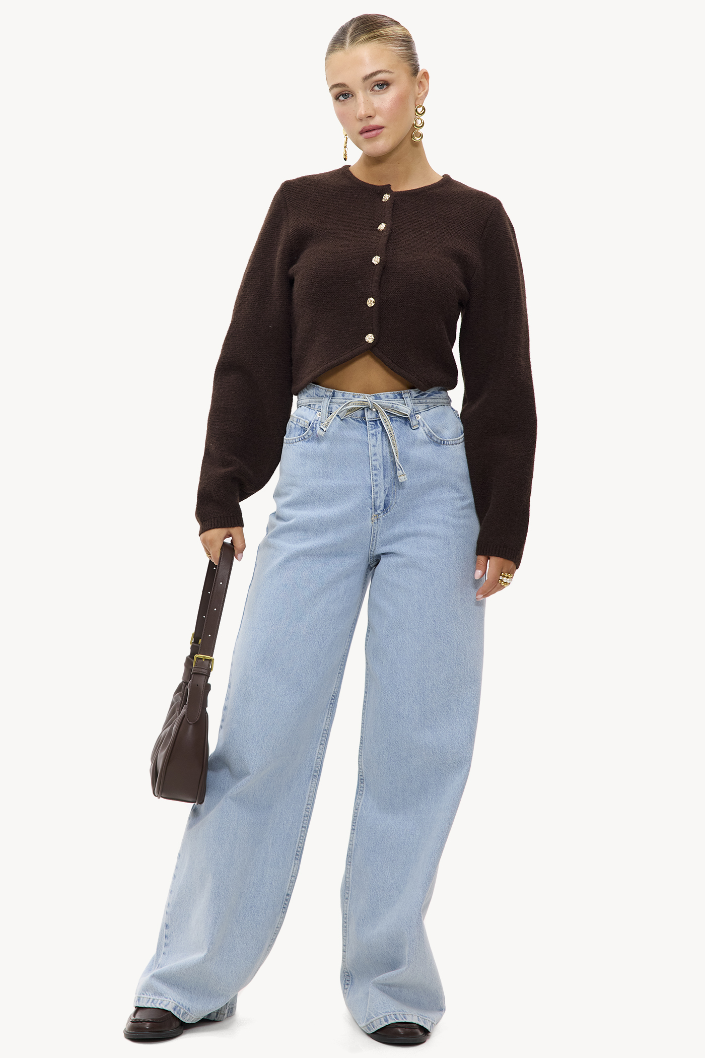 Estos jeans de pierna ancha tienen un lavado azul claro y un ajuste de cintura alta. Las piernas anchas crean un look de mezclilla relajado con un toque moderno. Los detalles clásicos de los jeans como el cierre de botones y los bolsillos dan una apariencia atemporal. Combina estos jeans con un crop top y tacones de punta para un look casual y elegante.