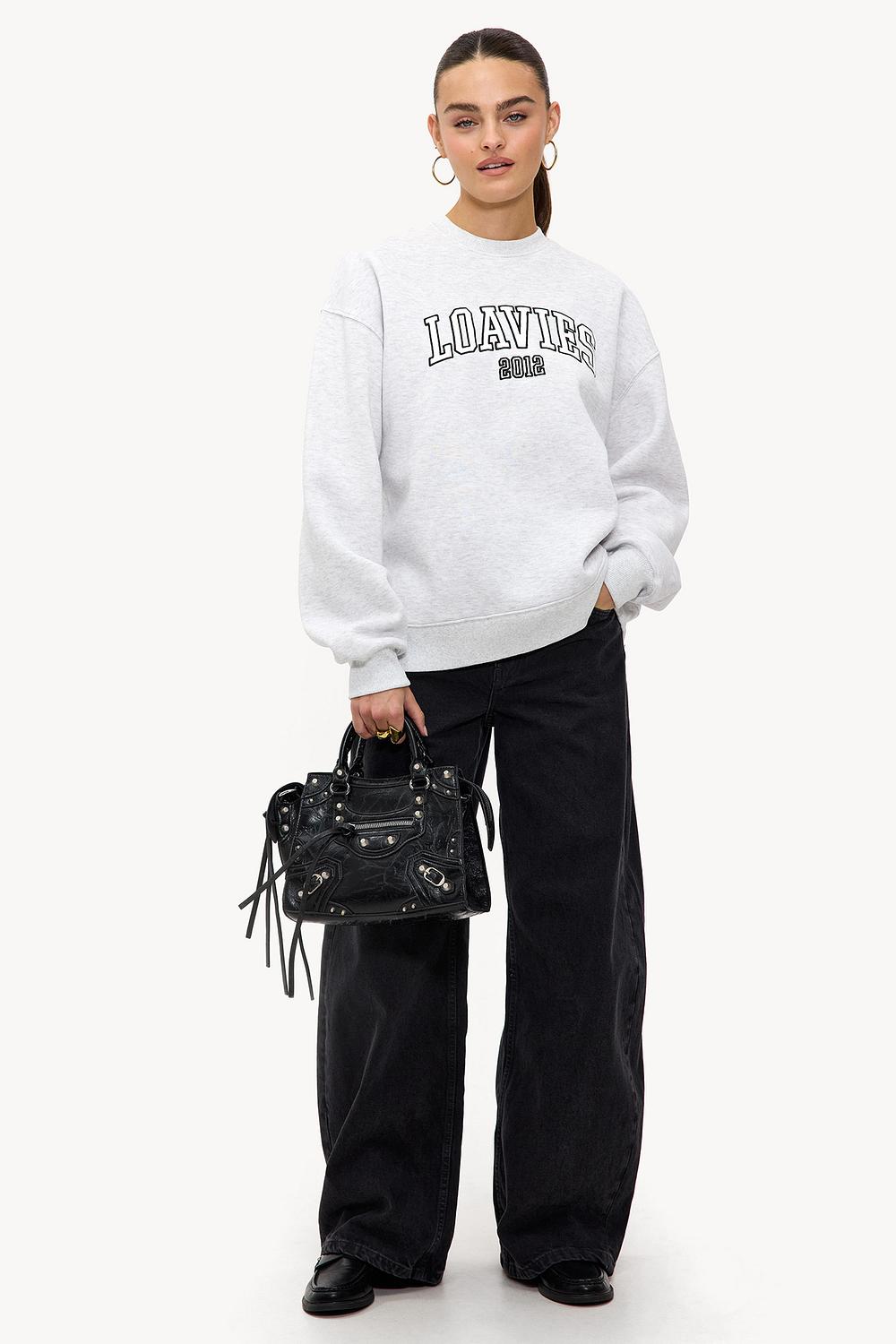 Este suéter oversize gris claro presenta un llamativo estampado LOAVIES 2012 en la parte delantera para un look distintivo. El ajuste relajado con acabado acanalado y cuello redondo crea una apariencia casual y cómoda. La suave tela de sudadera garantiza una comodidad óptima durante los días casuales. Combina este suéter con jeans de pierna ancha negros para un look streetwear sin esfuerzo.