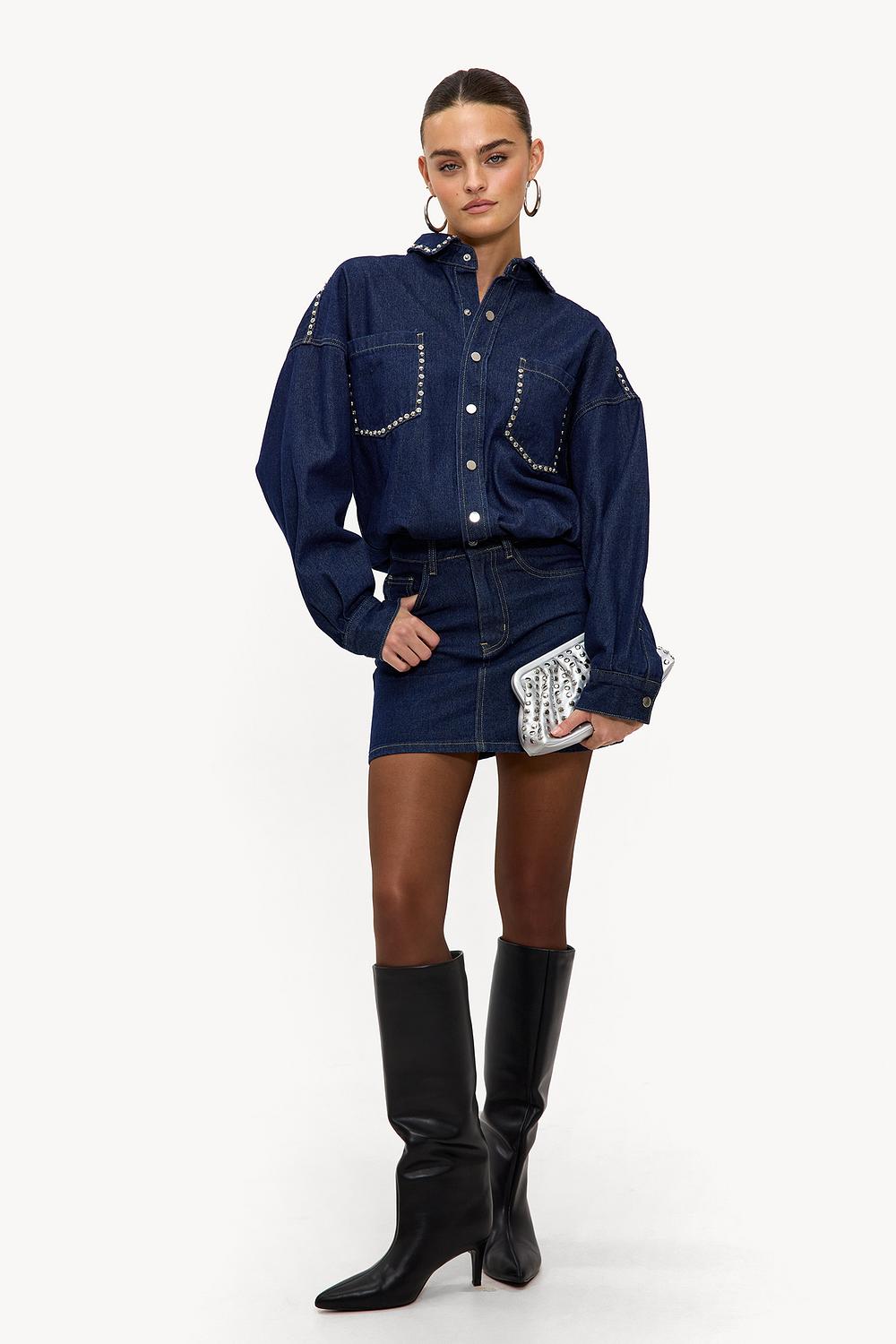 Vestido vaquero azul oscuro con tachuelas 69,99 €Este vestido blusa de mezclilla índigo presenta llamativos tachones por todas partes para un look audaz. El ajuste oversize con cierre de botones clásico y bolsillos en el pecho crea un giro moderno en el diseño atemporal de mezclilla. Las mangas largas con puños añaden un toque extra a este vestido genial. Combina este vestido con botas negras para un look rock-chic.