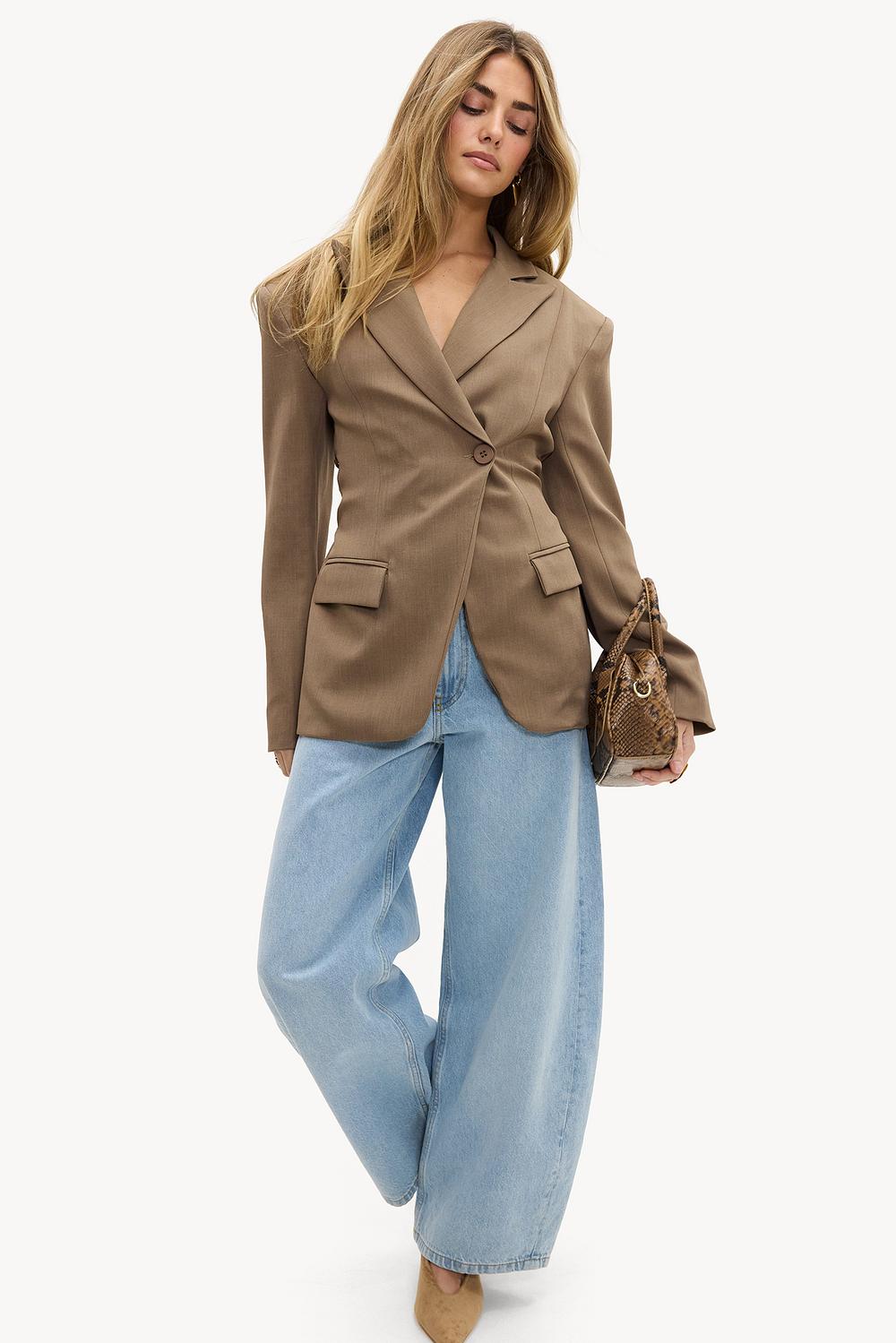 Blazer taupe 79,99 €Esta blazer taupe presenta un ajuste entallado con hombros sobredimensionados para un toque moderno. El cierre cruzado con botones contrastantes y las solapas clásicas crean un look chic. El ajuste entallado con un detalle de cinturón sutil acentúa elegantemente la forma. Combina esta blazer con jeans de pierna ancha para un look de oficina sofisticado.