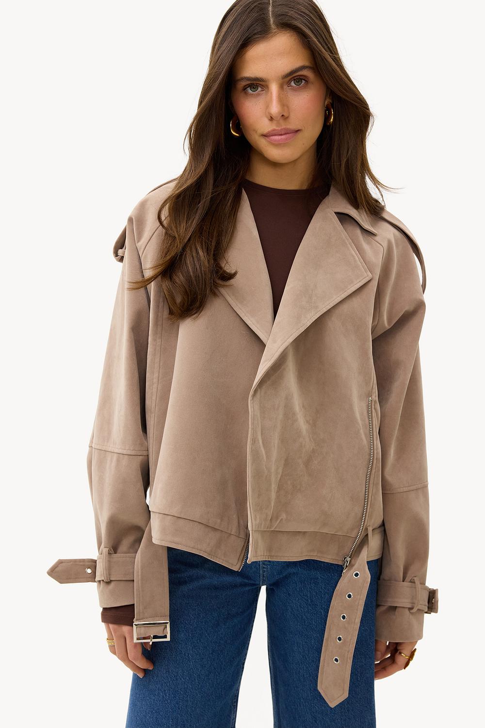 Esta chaqueta de motorista de aspecto de ante color arena tiene un ajuste extragrande con detalles llamativos. La cremallera asimétrica y el cinturón ancho con hebilla le dan a esta chaqueta un toque atrevido. La suave textura de ante se combina perfectamente con los elementos clásicos de motorista como el amplio cuello y la cintura. Combina esta chaqueta con jeans de pierna ancha para un look casual y fresco.