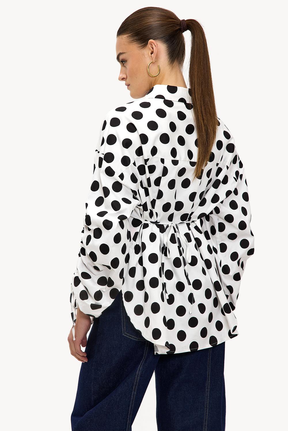Esta blusa blanca presenta un estampado clásico de lunares con puntos negros por todas partes. El ajuste oversize con mangas abullonadas y detalles de lazo en las mangas crea un giro moderno en el diseño atemporal. El cierre de botones y la calidad suave del algodón aseguran comodidad y una apariencia chic. Combina esta blusa con unos jeans ajustados negros para un look de oficina icónico.