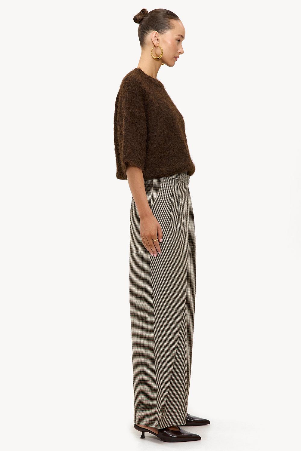 Estos pantalones de pierna ancha presentan un estampado clásico de cuadros marrones para un aspecto atemporal. El ajuste de cintura alta con piernas anchas crea una silueta elegante que se adapta perfectamente a las tendencias de moda actuales. La mezcla de algodón garantiza comodidad y facilidad de uso. Combina estos pantalones con el blazer a juego para un look completo y a medida durante los días de oficina.