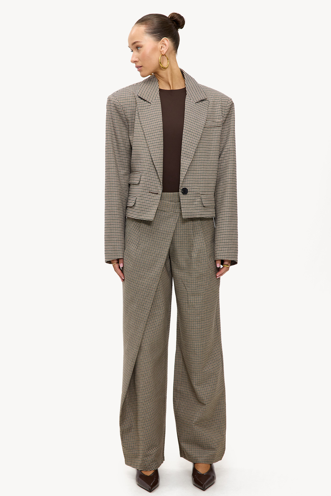 Pantalones marrones a cuadros con solapa 59,99 €Estos pantalones de pierna ancha presentan un estampado clásico de cuadros marrones para un aspecto atemporal. El ajuste de cintura alta con piernas anchas crea una silueta elegante que se adapta perfectamente a las tendencias de moda actuales. La mezcla de algodón garantiza comodidad y facilidad de uso. Combina estos pantalones con el blazer a juego para un look completo y a medida durante los días de oficina.