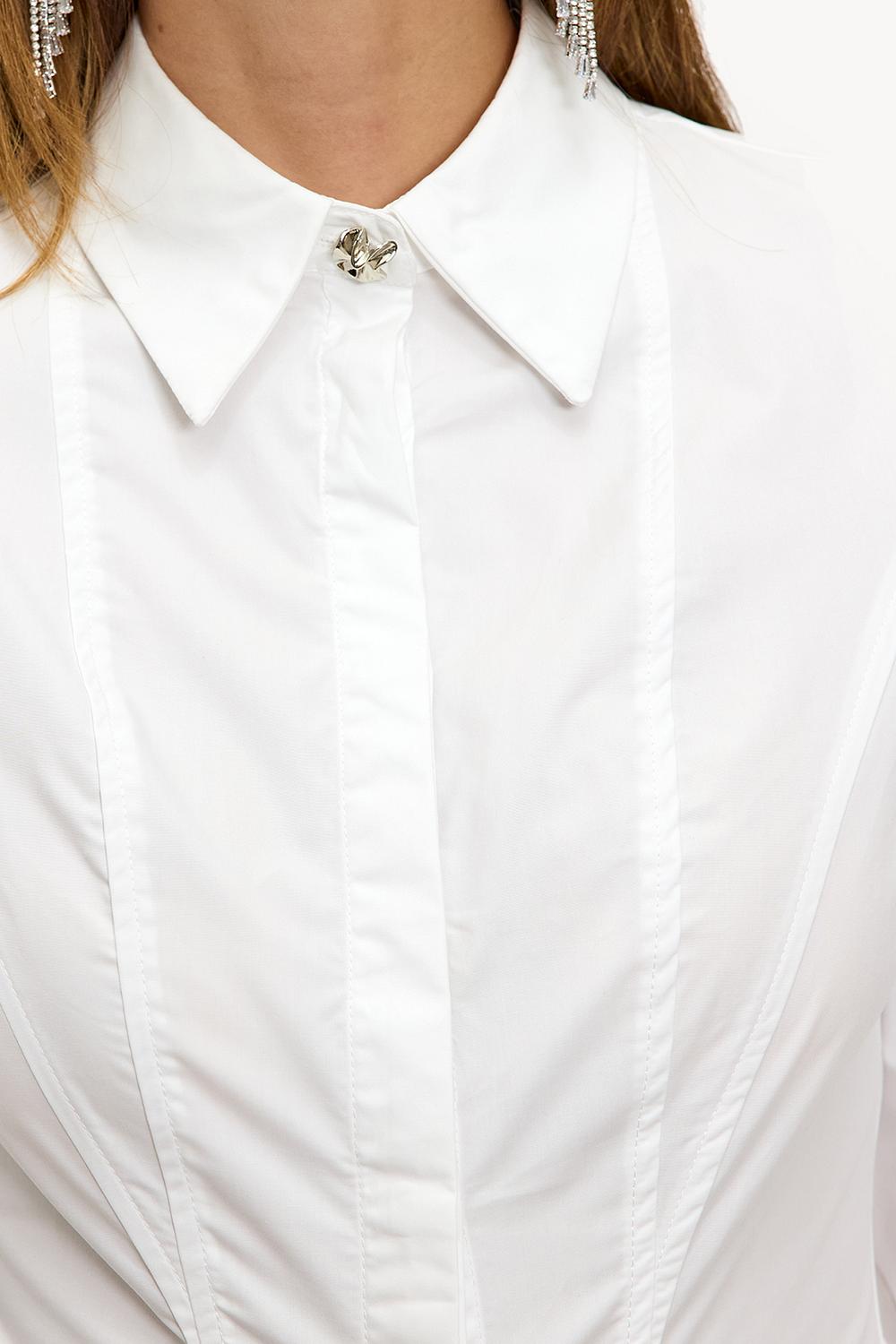 Esta blusa de algodón blanco tiene un ajuste entallado con detalles llamativos para un look elegante. El cuello clásico con cierre de botones sutil y el ajuste entallado crean una apariencia refinada. El 100% algodón asegura comodidad y una sensación lujosa. Combina esta blusa con pantalones anchos negros para un look listo para la oficina.
