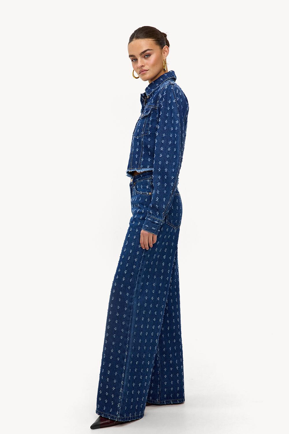 Estos jeans de pierna ancha y 5 bolsillos cuentan con un llamativo estampado integral con sutiles detalles desgastados sobre una base de denim profundo. El ajuste de cintura alta con piernas anchas crea un look llamativo con vibraciones vintage. La suave calidad del algodón asegura comodidad y una sensación de denim lujoso. Combina estos jeans con la chaqueta de denim a juego para un look coordinado completo.