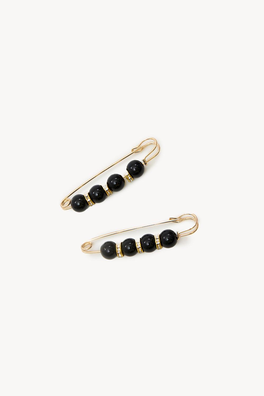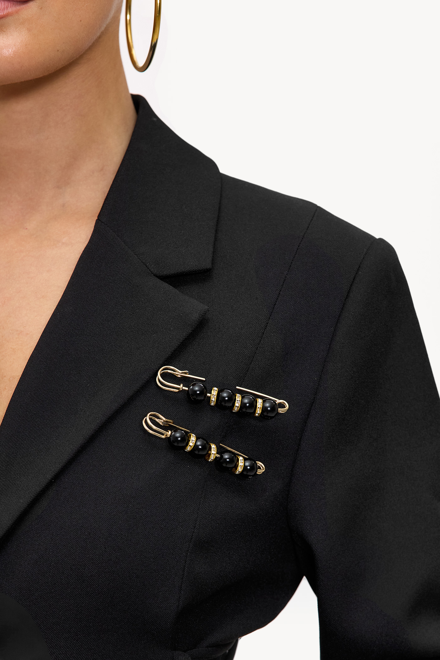Este conjunto de broches dorados cuenta con detalles de cuentas negras para un look de lujo atrevido. El acabado en acero inoxidable chapado en oro al 100% asegura una apariencia duradera y elegante. Perfecto para darle a tu blazer o chaqueta una actualización instantánea. Estiliza estos broches en un blazer negro para un look de oficina impactante.