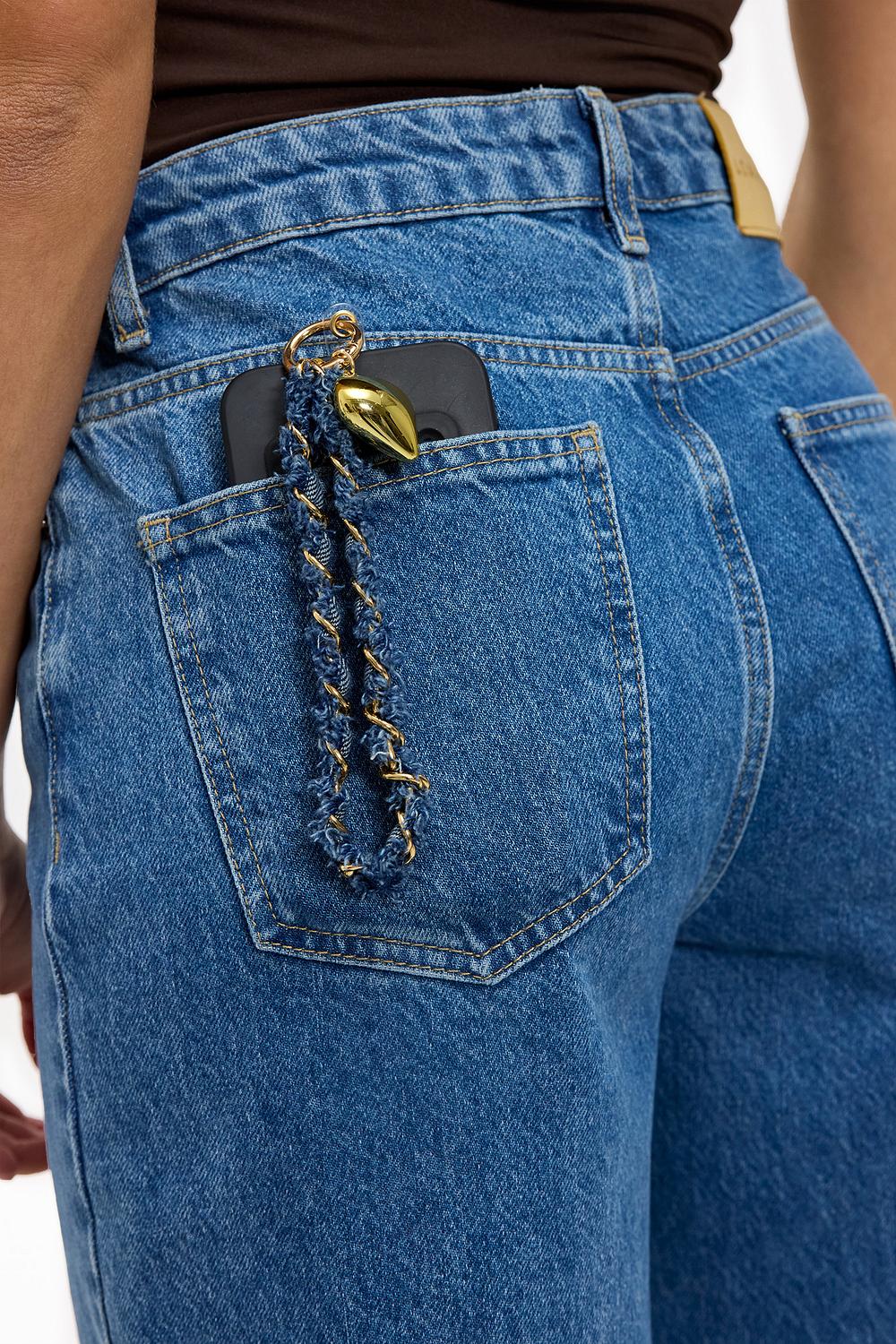 Este colgante para teléfono azul presenta una textura de mezclilla llamativa con detalles de cadena dorada. El corazón de metal dorado le da a este accesorio un toque lujoso. La banda de mezclilla texturizada proporciona un contraste fresco con los elementos dorados brillantes. Perfecto para darle a tu teléfono una actualización de moda.