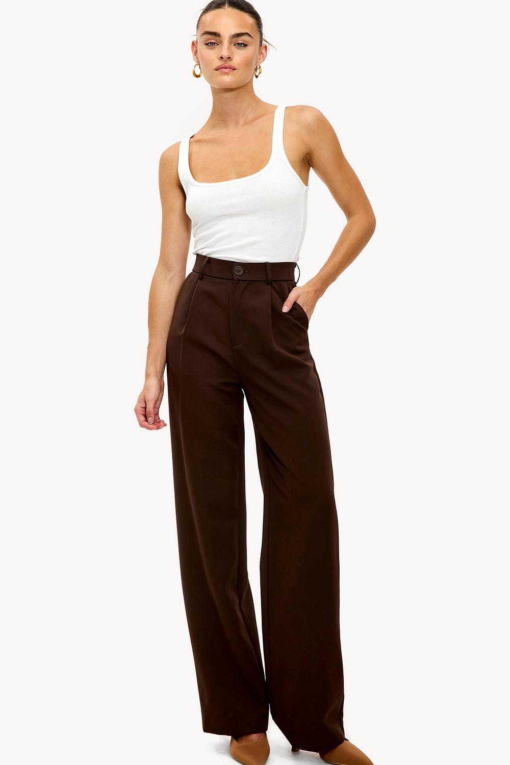 Estos pantalones rectos de color marrón oscuro tienen un ajuste a medida con un diseño de cintura alta para un look elegante. Las piernas anchas y el botón llamativo en el frente le dan a estos pantalones un giro actualizado. La suave mezcla de poliéster garantiza comodidad y una apariencia lujosa. Combina estos pantalones con el blazer a juego para un look de oficina sofisticado.