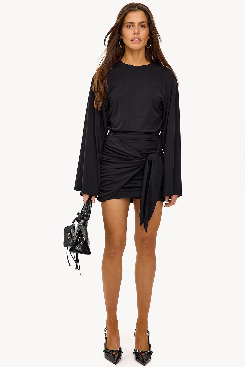 Este vestido mini negro cuenta con un detalle de envoltura llamativo con un lazo drapeado en la cadera. El ajuste ceñido con mangas acampanadas sobredimensionadas proporciona un contraste lujoso. Los detalles fruncidos y la longitud mini crean un look de fiesta elegante.