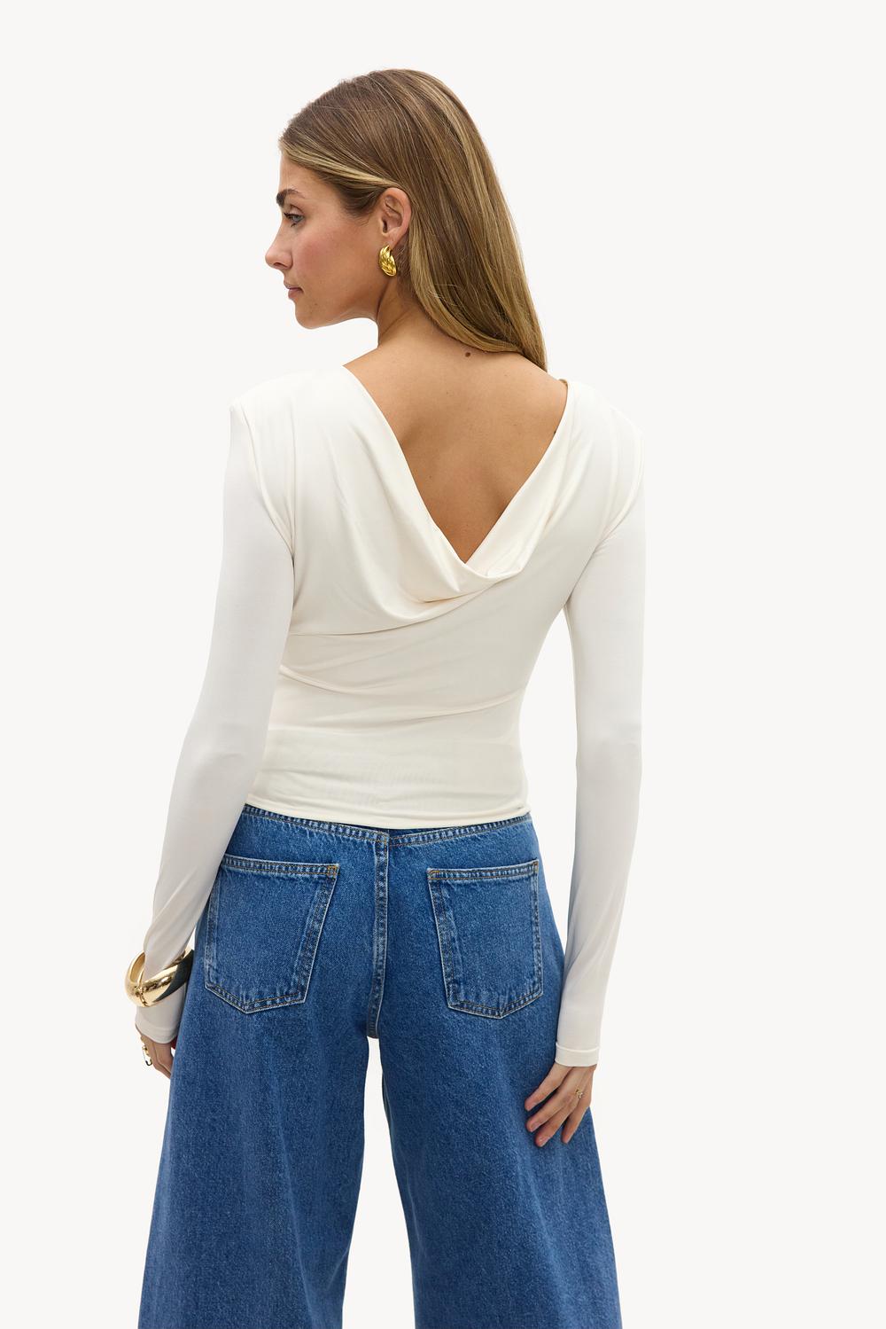 Esta camiseta de manga larga en color blanco roto tiene una llamativa espalda con cuello drapeado para un look llamativo. El diseño ajustado con mangas largas crea una apariencia elegante. La mezcla de poliéster suave asegura comodidad y una sensación lujosa. Combina este top con jeans de pierna ancha de cintura alta para un look casual sin esfuerzo.